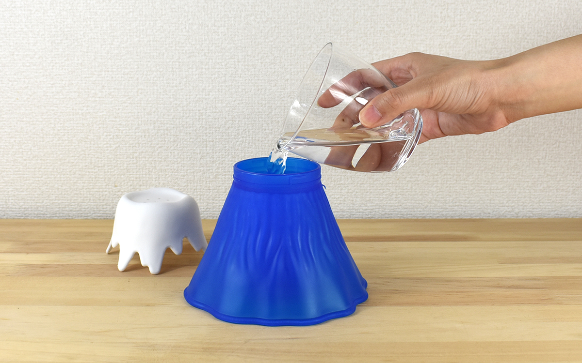 サイズは約14(幅)×11.5cm(高さ)。雪を被ったような白いふたが外せるようになっていて、中はコップ状にぽっかりと口が開いています。必要になるのは水(約100cc)と酢(約70cc)。パっと計量できなくても側面に「WATER」と「VINEGAR」の刻印があるので、それぞれの目安にしてください。