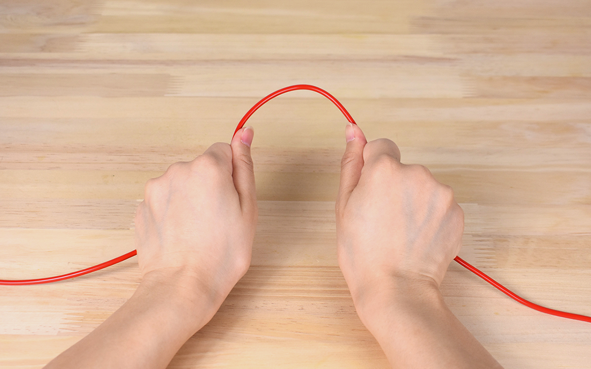 同商品は“曲げる・ねじる・巻きつける”といった加工を簡単にこなせるのが特徴。塩化ビニルに覆われたワイヤーはやわらかく、わずかに力をかけただけで曲げ伸ばしできました。