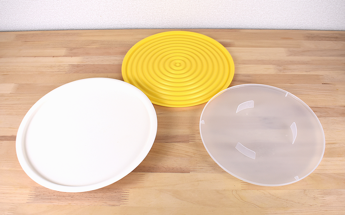 外蓋・内蓋・トレーがセットになった同商品のサイズは、3つ重ねた状態で約260(直径)×45mm(高さ)。半透明の内蓋は表側に持ち手があり、裏面にも小さな突起が3か所についているのが特徴です。