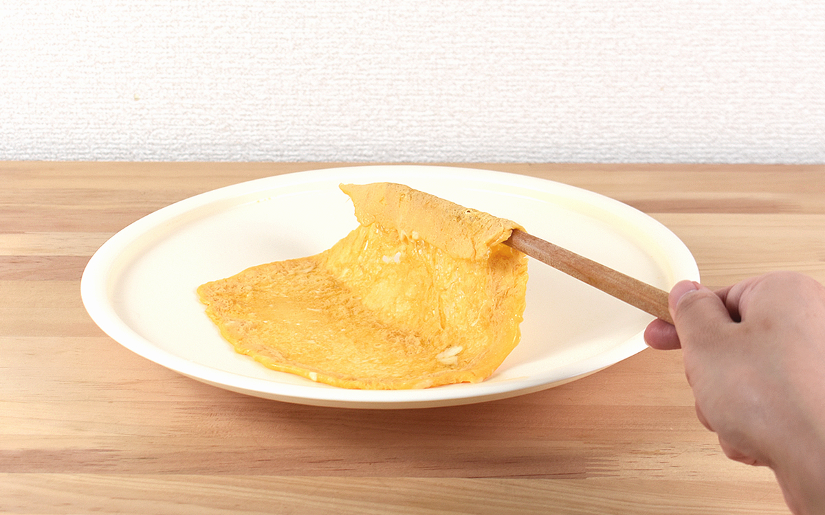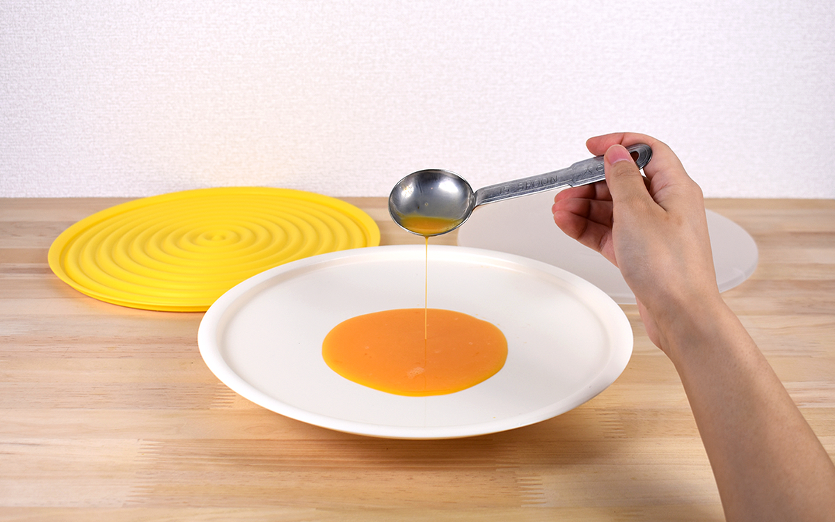 予め温めておけばよりきれいに仕上がるということで、まずはトレーに水を入れて内蓋・外蓋を被せて加熱。トレー上のお湯を捨て、水気を拭き取ってから準備に入りましょう。トレーと内蓋下面に油をごく薄く塗ったらトレーに溶き卵を入れ、内蓋をセット。あとは外蓋を重ねて、電子レンジで加熱(500W~600Wで約1分10秒~1分30秒)すれば完了です。