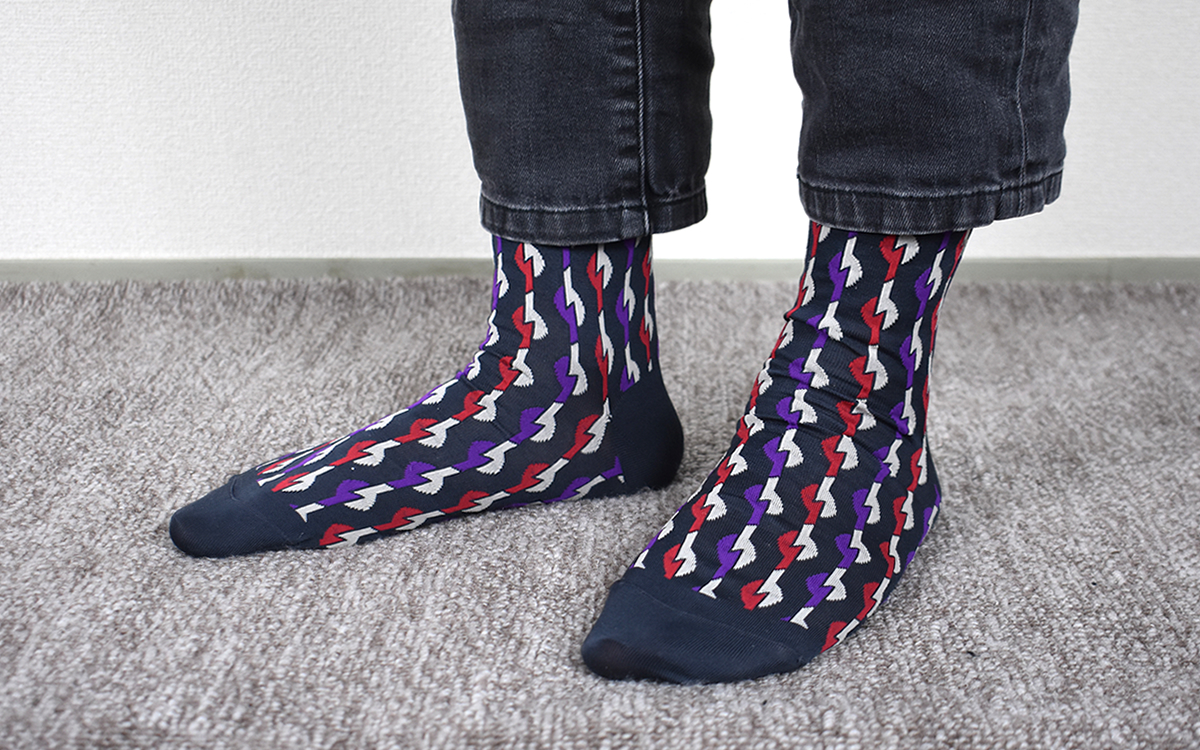 実際に履いてみたところ、やはり目を引くのは“Towa”の名に相応しい永遠に続いていくような不思議な柄。赤・白と紫・白の模様がいかにもカラフルですが、ベースとなるシックなチャコールカラーとのバランスがよく悪目立ちしていません。