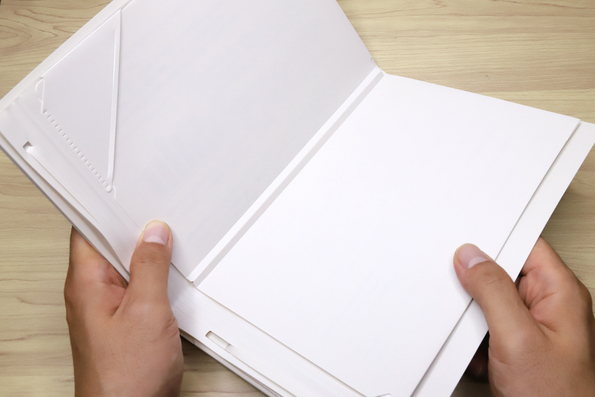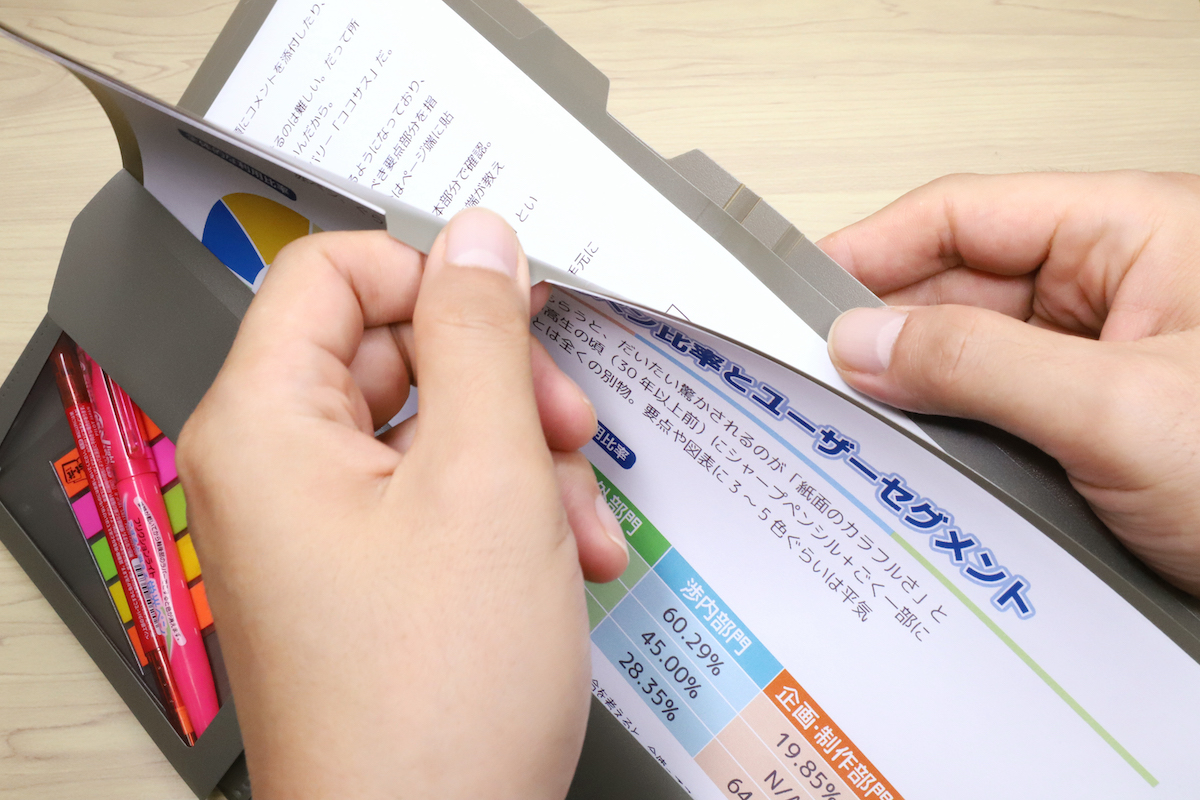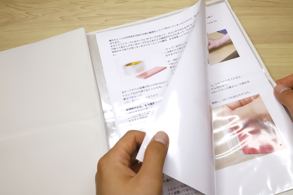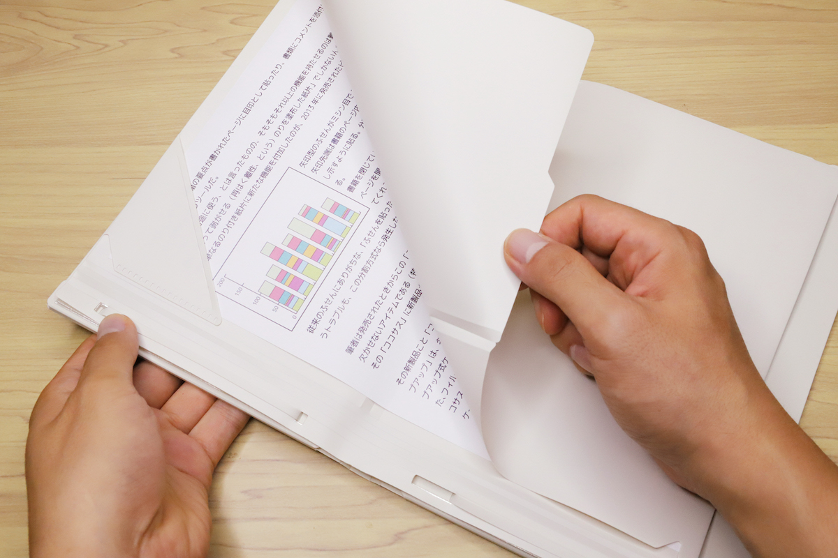 また、ルーズリーフのように紙の抜き差し自在だが、リング穴は不要、という便利さが最大のポイントと言える。
