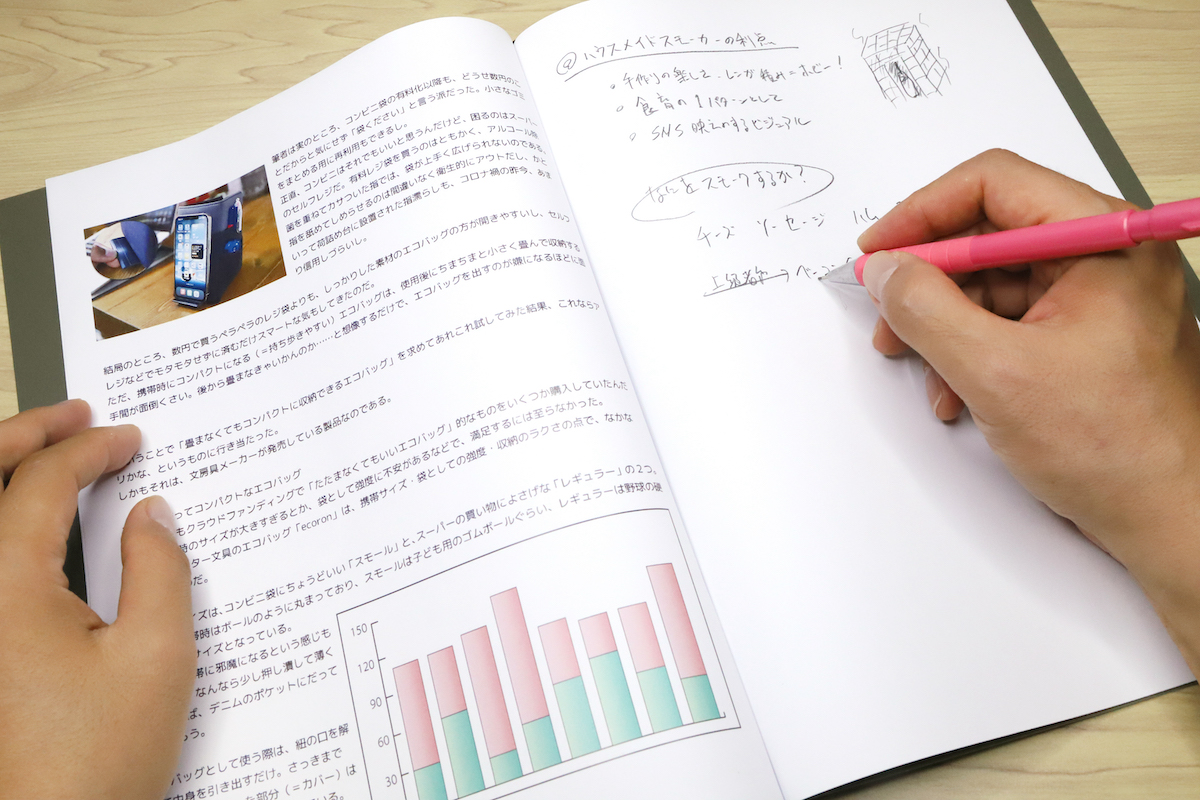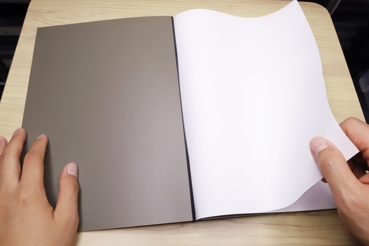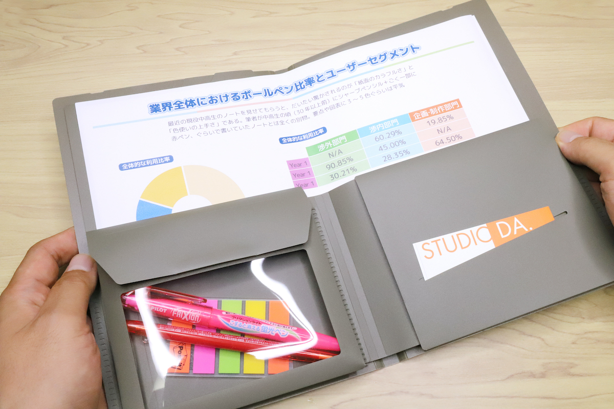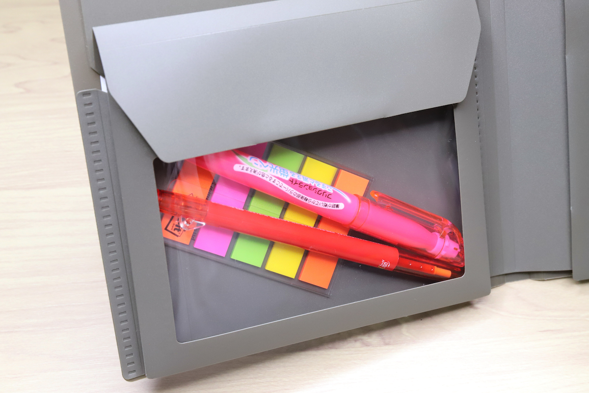 また、ルーズリーフのように紙の抜き差し自在だが、リング穴は不要、という便利さが最大のポイントと言える。