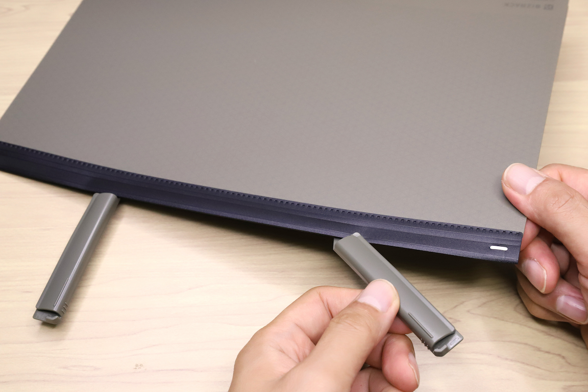 とはいえ背周りがコンパクトな分だけ、表紙は非常に開きやすい。表紙を360度折り返して使うこともできるほどで、これは閲覧だけでなく立ったまま筆記も可能というメリットがある。また、背が薄い=全体的にスリムということで、カバンに突っ込むときも、よりスムーズに入った。