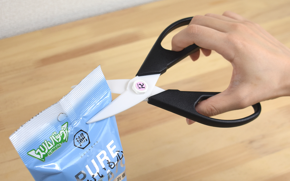 セラミック製の包丁を使うことはあっても、セラミック製のはさみを使うのは初めての私。おそるおそる未開封のパッケージで切れ味を試してみたところ、スっと刃が入って力をかけることなく切ることができました。ステンレスに比べて軽量ということもあり、抵抗なくサクサク切り進められる感覚に「これは気持ちいい……」と声が漏れたほどです。