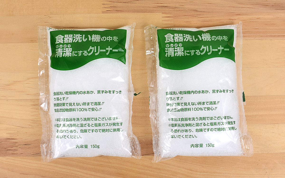 食洗機内の汚れを落としてくれるだけでなく、除菌効果も併せ持つ同商品。パッケージに入っていたのは約150gの洗浄剤2袋で、使用方法を見ると6人用より小さい機種には1袋、6人用より大きい機種なら2袋の中身を均等にまぶすよう記されています。