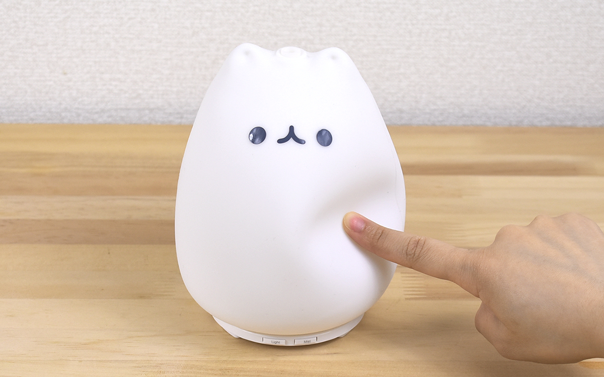 ねこ型の本体カバーはシリコン製でできており、スベスベしたなめらかな手触り。まるでスクイーズのように“ふにゃっ”と柔らかく、思わず指でつつきたくなる感触でした。高さは約17cmで、卓上に置いて邪魔にならないサイズ感もポイントですよね。