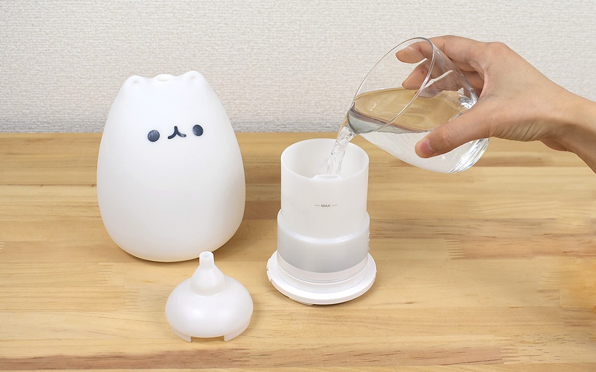 実際に使う際は水タンクの水位線まで水を注ぎ、手持ちの精油を1~3摘垂らしましょう。吹き出し口のついた蓋をセットし、上からねこ型カバーを被せれば準備完了です。