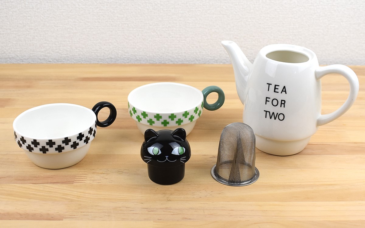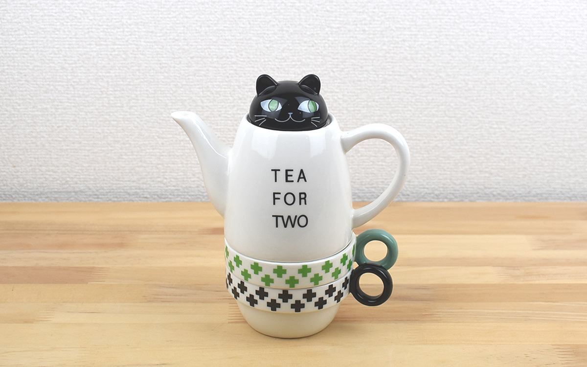 同商品はネコタイプやイヌタイプなどが展開されていて、今回はひょこっと飛び出た表情がかわいらしいネコタイプをセレクト。重ねた状態だと1つのティーポットのように見えますが、ご覧のとおりティーカップが2つもセットになっているのが特徴です。本来なら食器棚の中でかさばりがちなポットとカップも、重ねて収納することでスペースを取りすぎてしまう心配がありません。