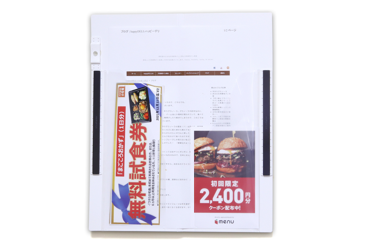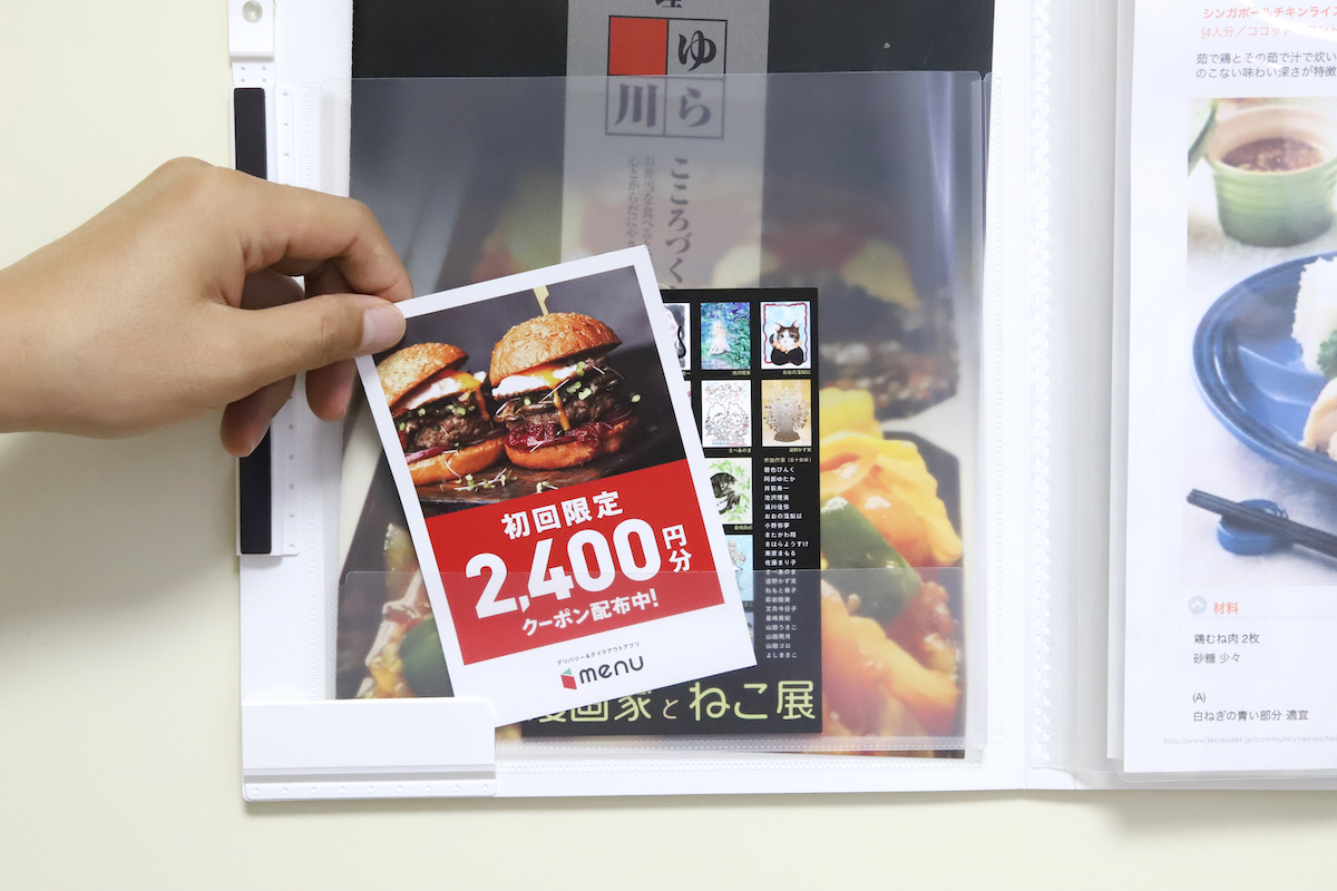 今冷蔵庫にマグネットで貼っている紙ものを全部ファイリングしてしまえば、設置場所もすぐに確保できるだろう。ひとまず必要と思うものを片っ端から放り込んでおけるため、「前にもらったクーポン、どこにあったっけ?」というときも、このファイルを開けばきっと見つかるはずだ。