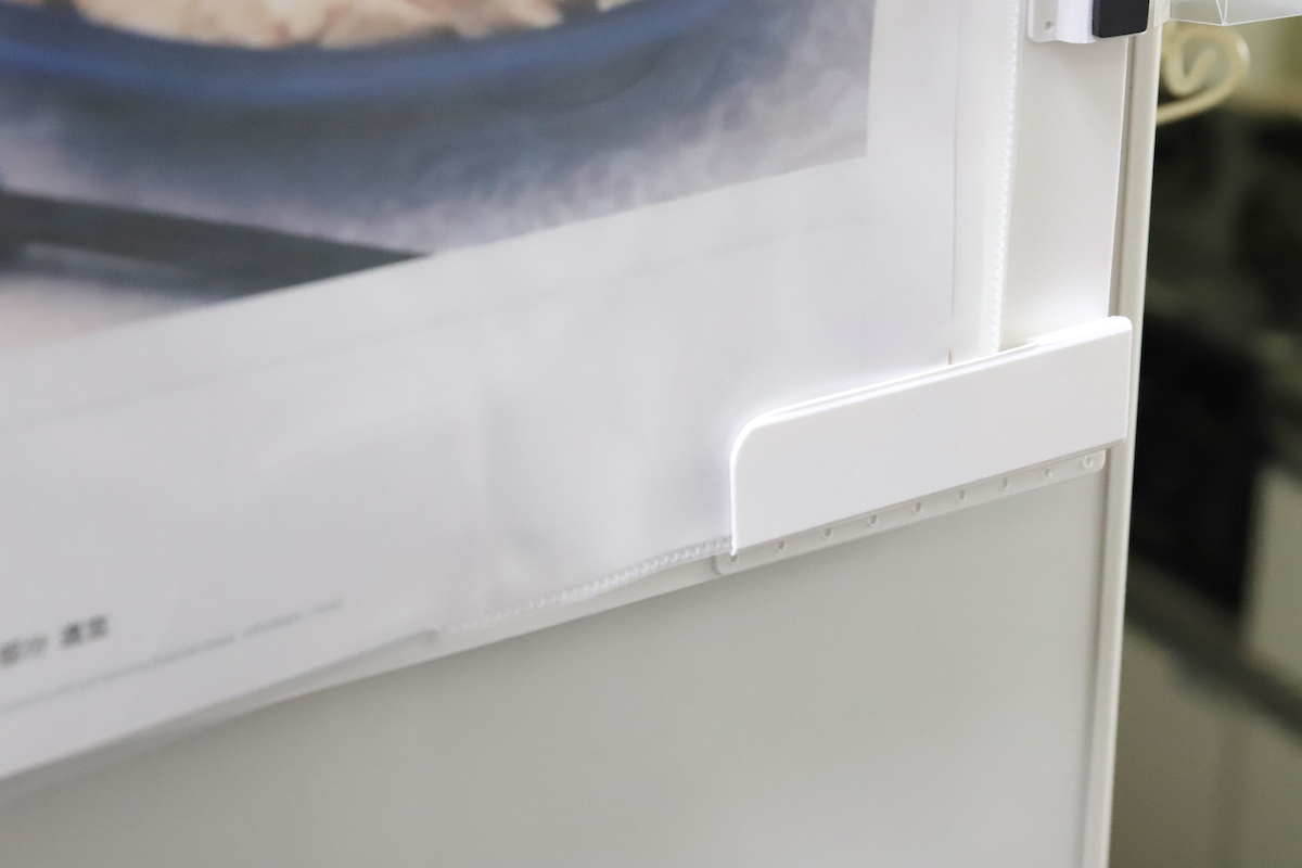 いかにもキングジム製品らしいなーと感じるのは、細かな気の利いたパーツ類である。例えば、表紙を閉じたままで固定できるマグネット。狭い台所周りで表紙が勝手に開いてしまうと邪魔なので、これは絶対に必要だ。ホワイトボードとして使う際の使いやすさにも影響する。
