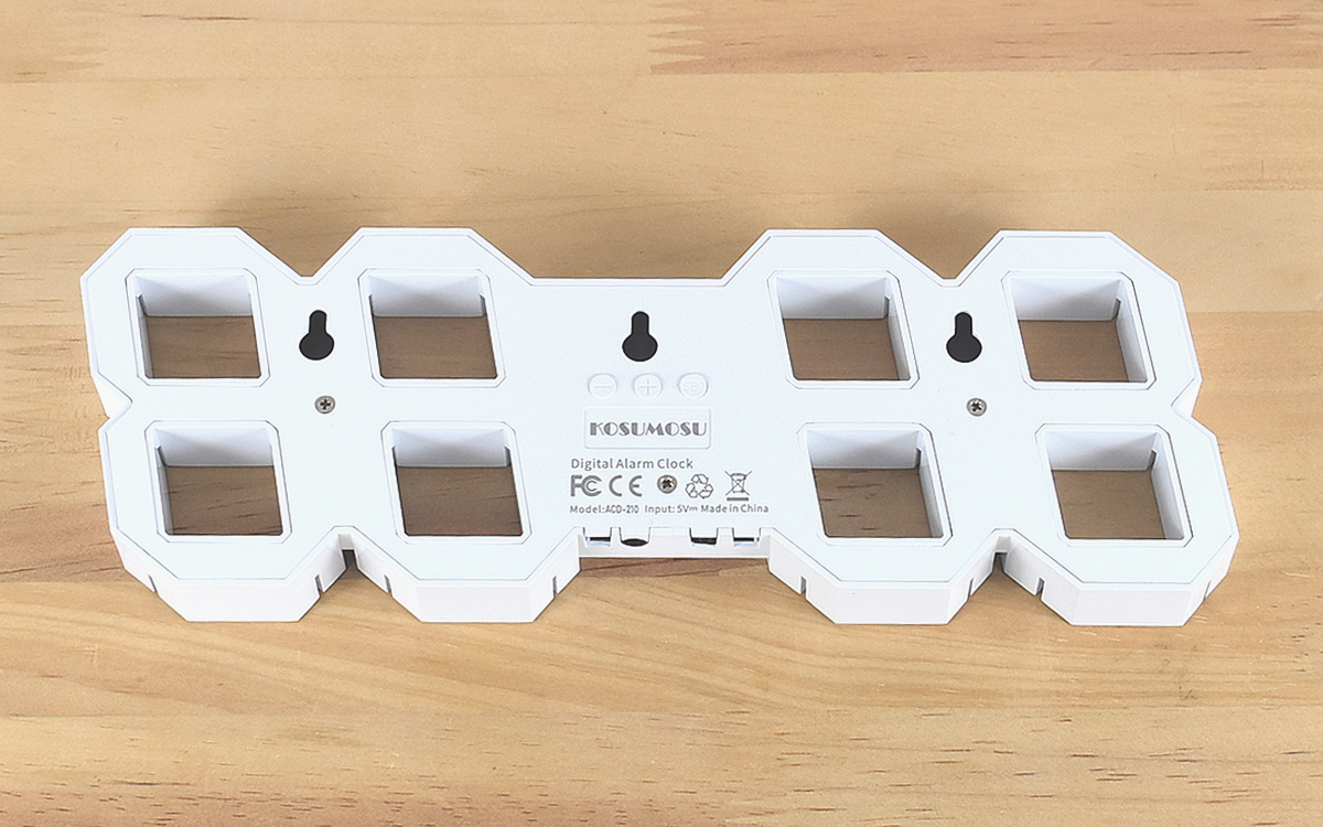 時計自体は約240(幅)×85(高さ)×21mm(奥行き)で、大きすぎず邪魔にならないサイズ感。裏側を見てみると、設定ボタンと壁掛け用の穴がありました。本体のボタンはもちろん、リモコンでも明るさの調整やアラームの設定が簡単におこなえます。また壁掛けの穴が3つあり、中央と両端で固定できるのもポイント。