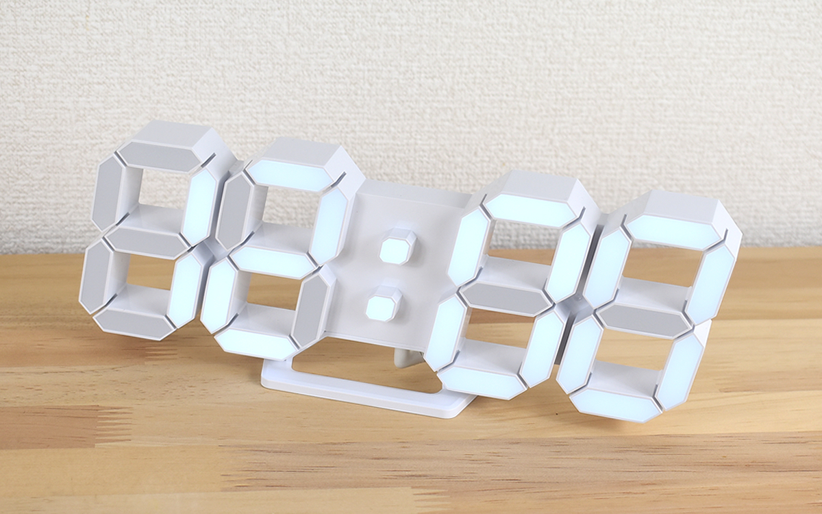 インテリアのアクセントになるおしゃれな時計を探していた私。スタイリッシュな見た目と使い勝手の良さに惹かれて購入したのが「3D LED CLOCK」(1980円/税込)です。今回はライトが白色に光るタイプをセレクトしました。
