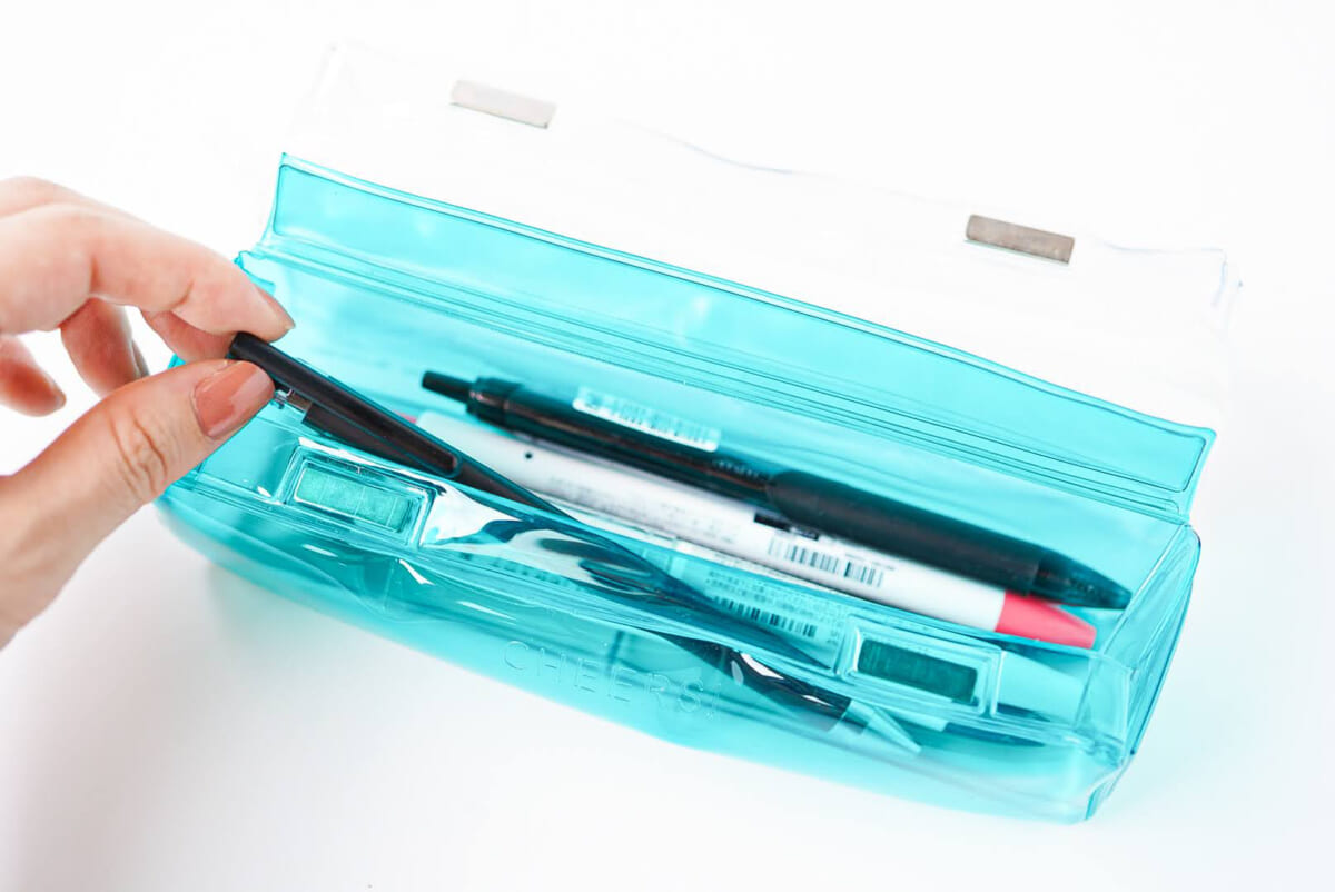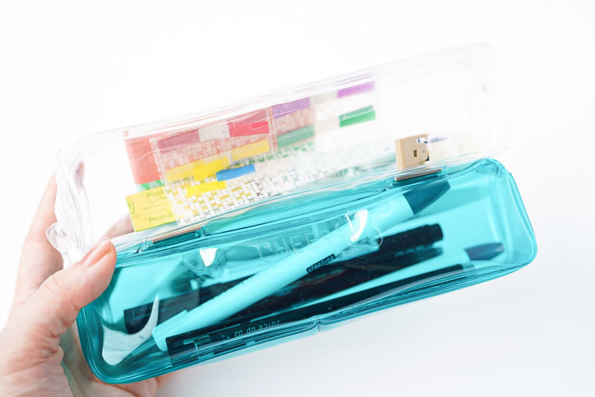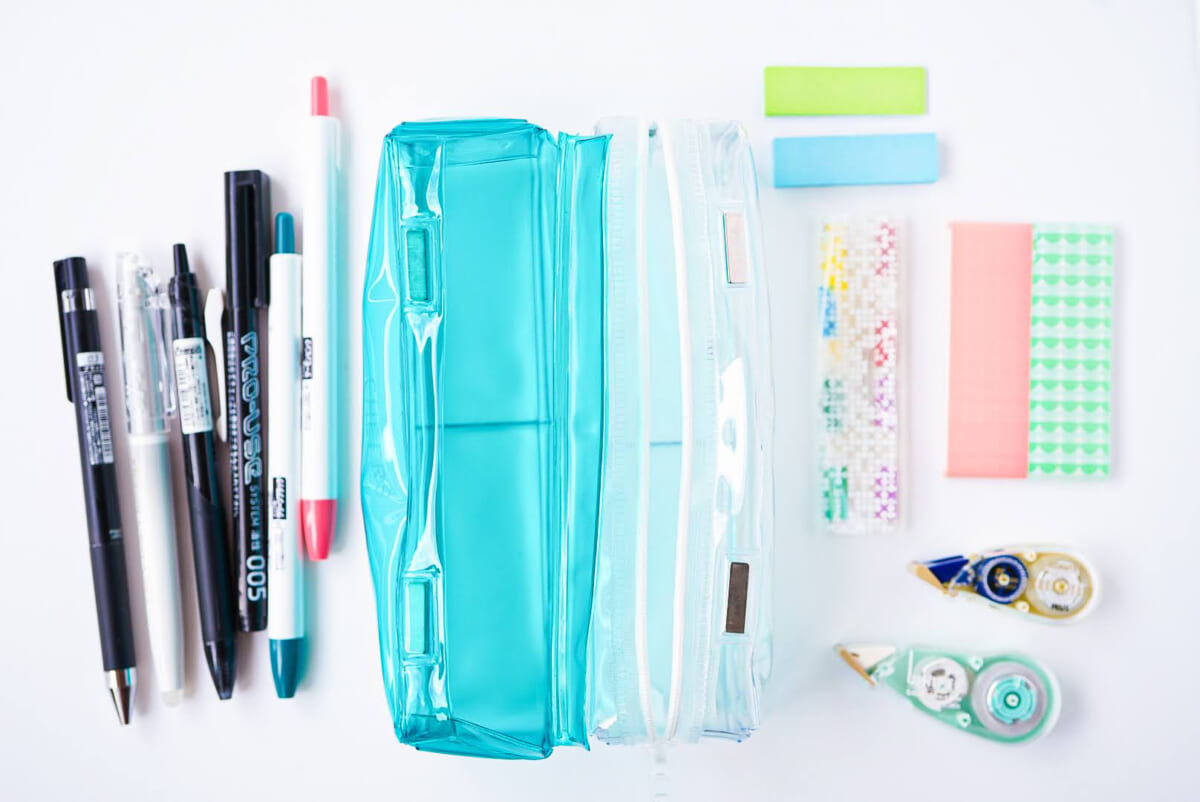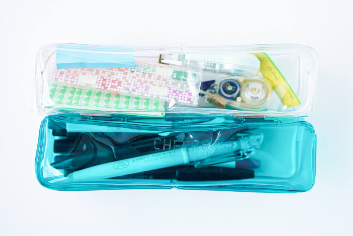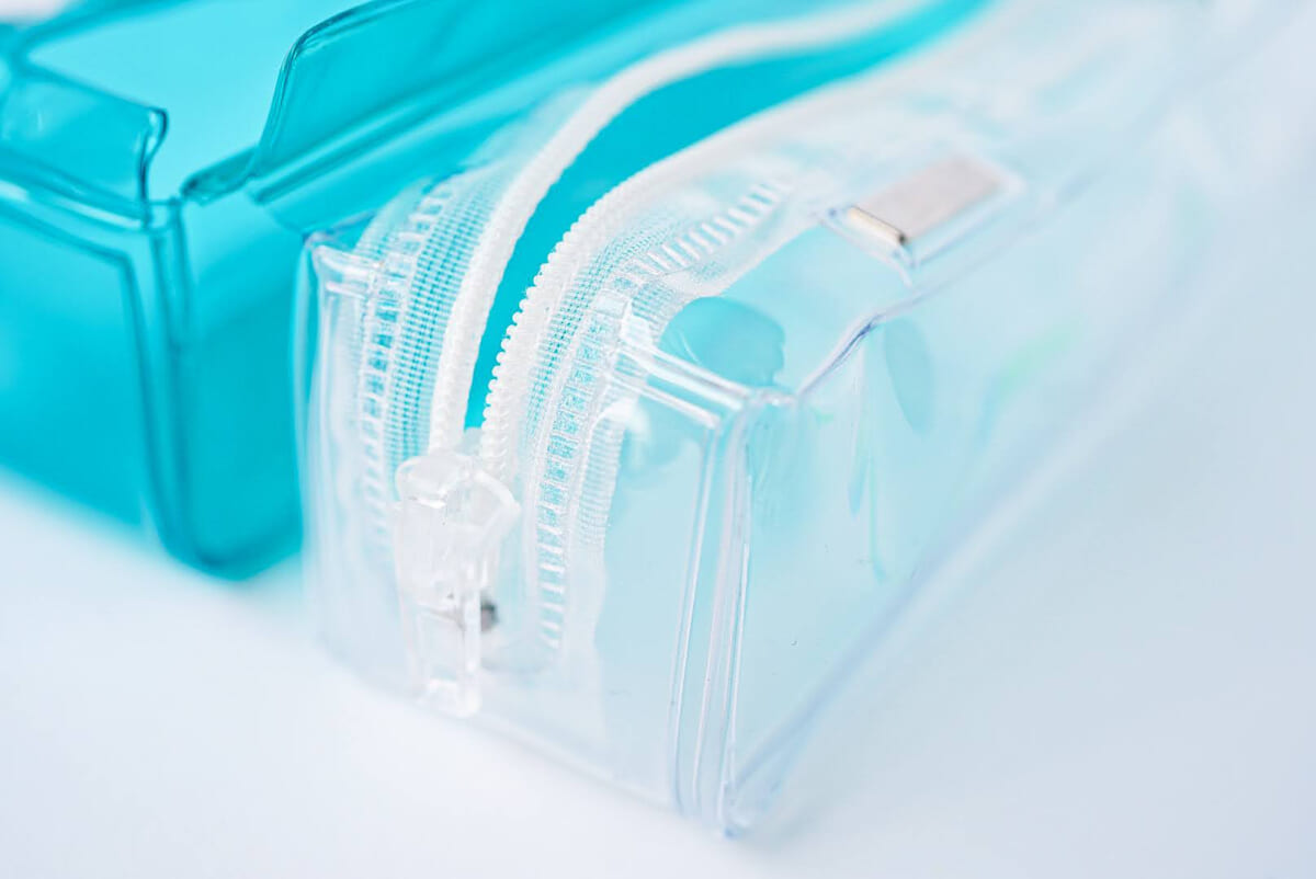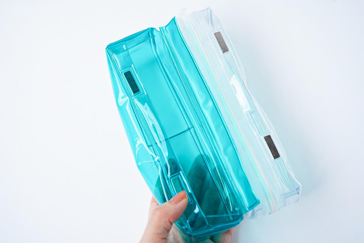 一方、色のないクリアなケースは、ファスナーがきちんと側面まで来ているのもポイントです。こうなっていると口が大きく開くので、中身を取り出しやすいのです。コストダウンのためにファスナーが短いペンケースも少なくないので、ここは要チェックです。