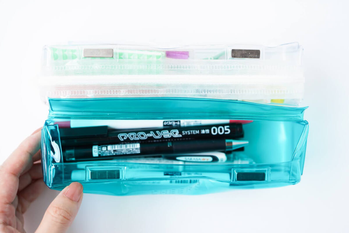 このようにスペースが分かれていることで何に役立つかというと、“使用頻度によって使い分けられる”ということです。クリアの方はファスナーで開閉しますが、クリアカラーの方(写真ではミドリの方のケース)にはファスナーがないので、すぐに中身を取り出せるのです。だから私は、こちらには普段よく使うペンを入れています。