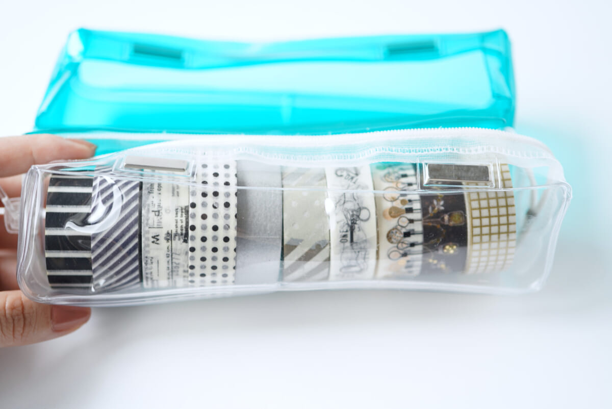 もう一方の透明なスペースにはファスナーがついていますから、たまに使う付箋や修正テープ等を入れています。スペースはかなり大きく、マスキングテープなら通常の太さで10本が入ります。大容量も、この手のペンケースの魅力ですね。