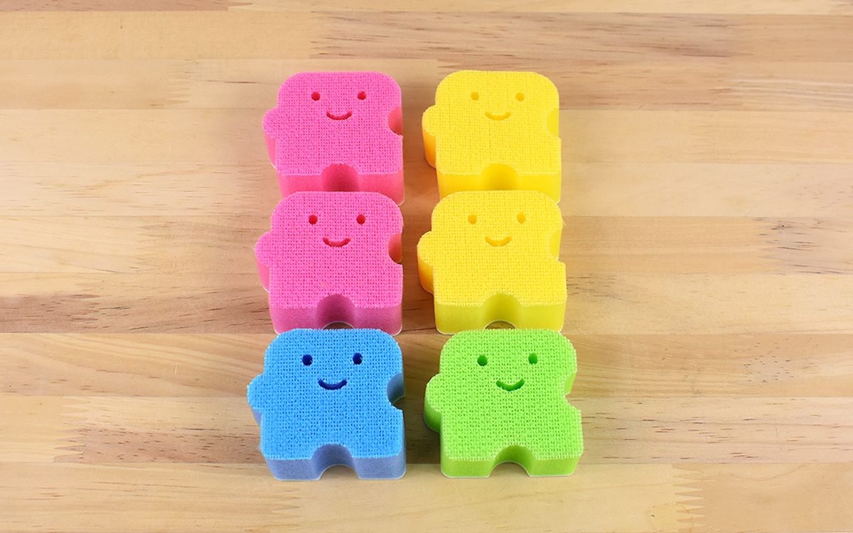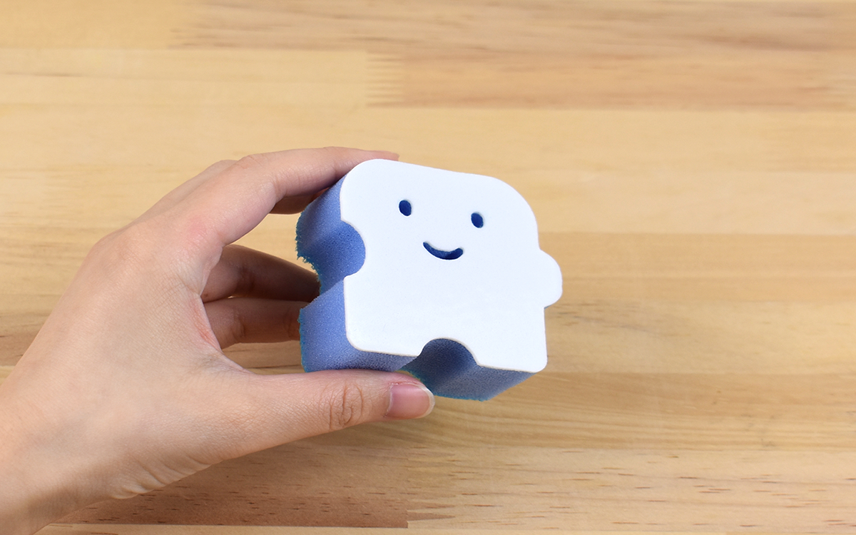 にこっと笑った顔がかわいいデザインの同商品は、手のひらにおさまるほどのサイズ感。側面が手足のように出っ張っていて、パズルのピースに近い形をしています。触ってみると、スポンジ自体は想像以上にやわらかい手触りでした。