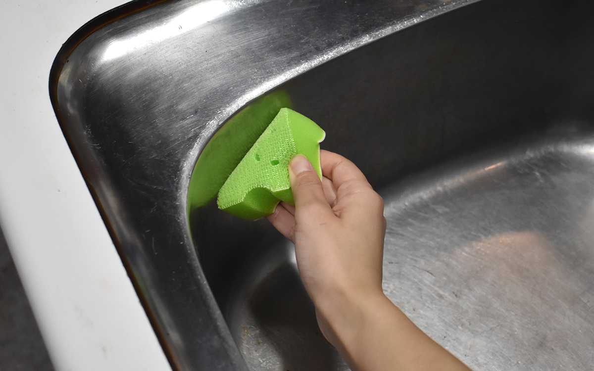 それでは実際に同商品の力量を試してみましょう。シンクを掃除してみたところ、洗剤を使わなくても水垢などの汚れが簡単に落ちていきます。手のひらサイズで力が入りやすいのもポイント。また足にあたる部分は角が尖っているため、細かい場所の掃除に便利ですよ。