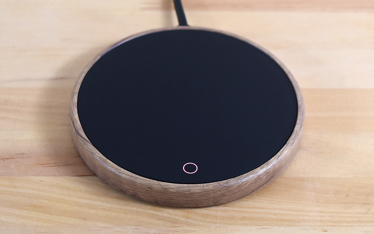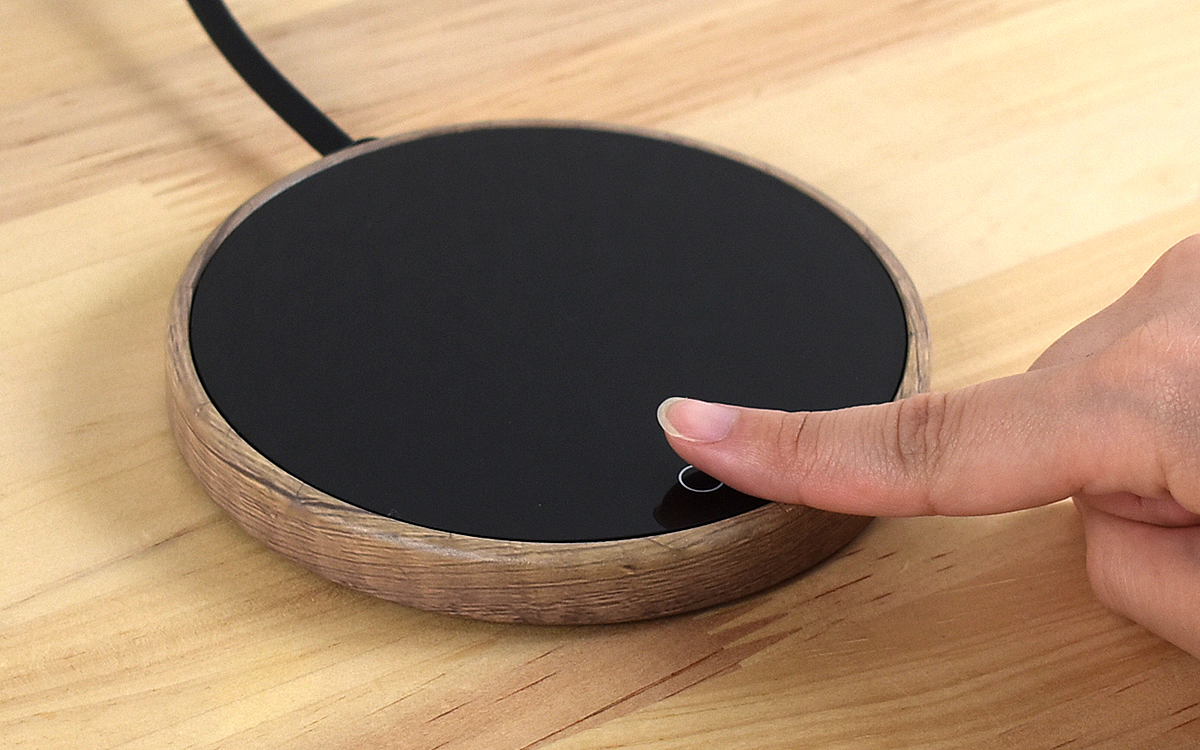 同商品のサイズは120(直径)×13mm(厚さ)。本体をぐるりと囲む木目がおしゃれ感を演出する一方、ガラスパネルを採用した表面には電源の丸印があるだけです。操作方法も至ってシンプルで、コンセントに差したら指で丸印をトンと触れればOK。白い丸印が赤色になり、すぐにガラスパネルが熱を帯びていきます。