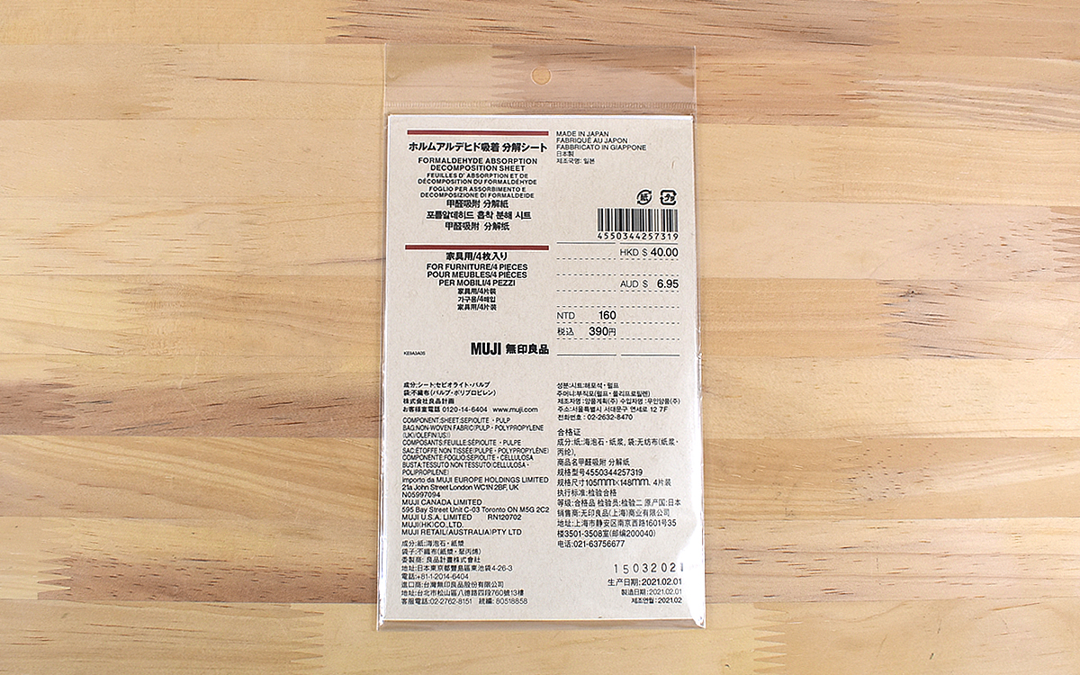 みなさんは新しい家具を使用し始めてから、目や鼻に痛みを感じた経験はありませんか? その原因となるのが、家具に限らず住宅からも発生するホルムアルデヒド。健康被害をもたらす物質だけに、換気などの対応をしている人は多いと思います。私もホルムアルデヒド対策に活用しようと、無印良品で販売中の「ホルムアルデヒド吸着・分解シート」(390円/税込)という商品を購入してみました。