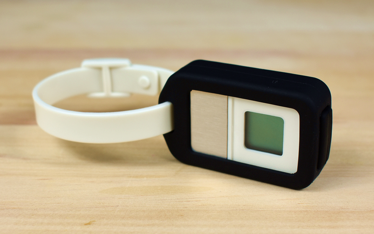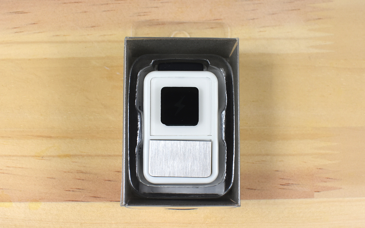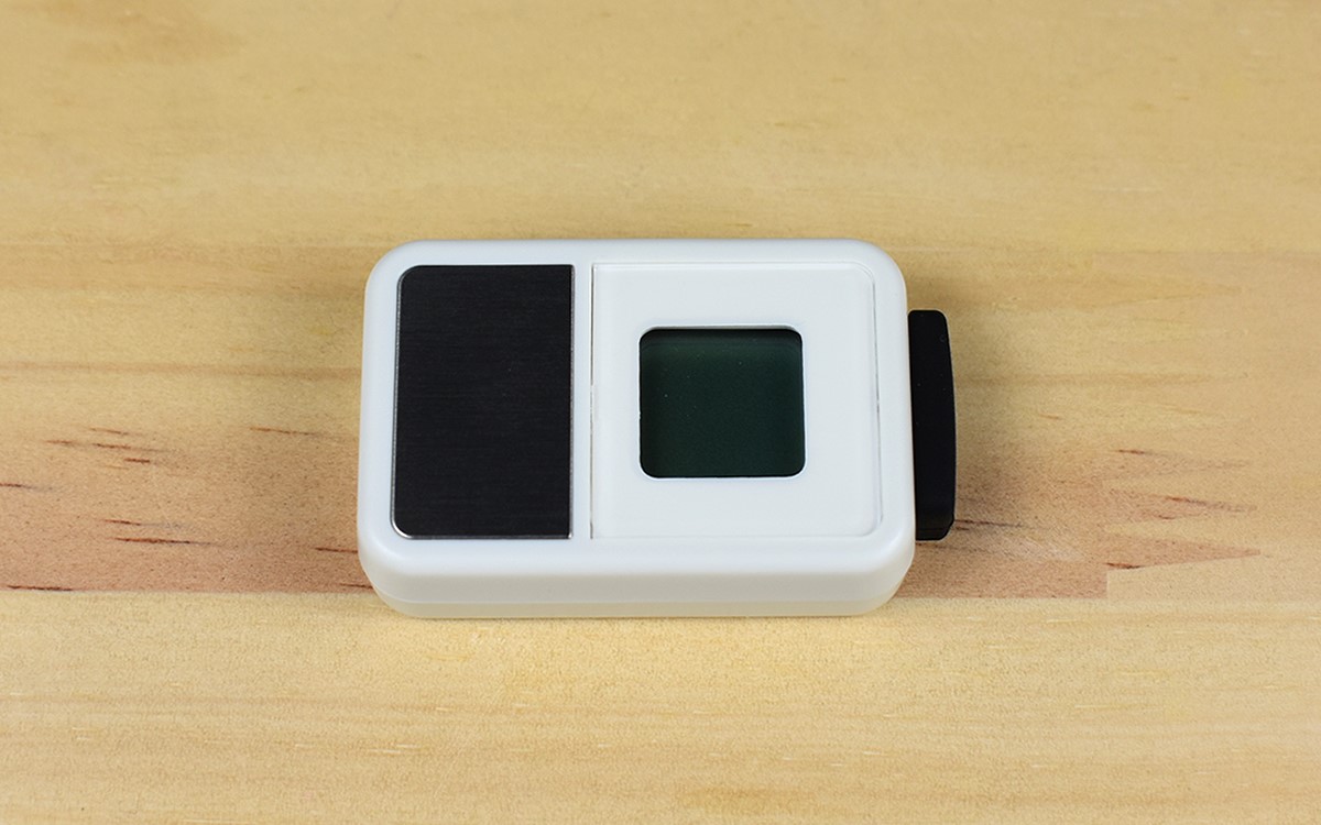 静電気除去アイテムといえば、スティック型やブレスレットタイプなど形状は様々。同商品の場合は約45(幅)×13(奥行)×30mm(高さ)の小さな箱型で、従来品には見られない液晶表示部を実装しているのが特徴です。他に導電ゴムや銀色のプレートも備えていますが、重量は約13gしかありません。
