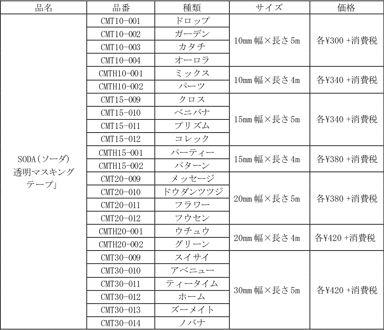 キングジムは、貼ってはがせる透明フィルム素材のマスキングテープ「SODA(ソーダ) 透明マスキングテープ」シリーズに、箔押しタイプや新サイズの10mm幅、「アデリアレトロ」とのコラボデザインを含む24種類の新デザインを、12月3日から発売します。
