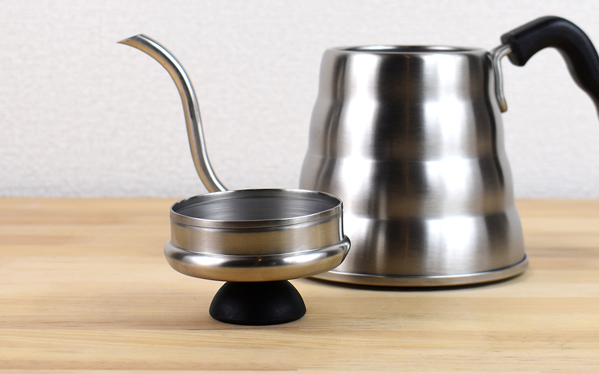 美しいステンレスボディが際立ち、まさに“洗練されたデザイン”という言葉がぴったりの同商品。もちろん使いやすさも追求されていて、たとえば注ぎ口はお湯をコントロールしやすいよう細く緩やかなカーブを描いた形状に。外した際に転がりやすいフタも、平置き可能なフラットツマミが採用されています。