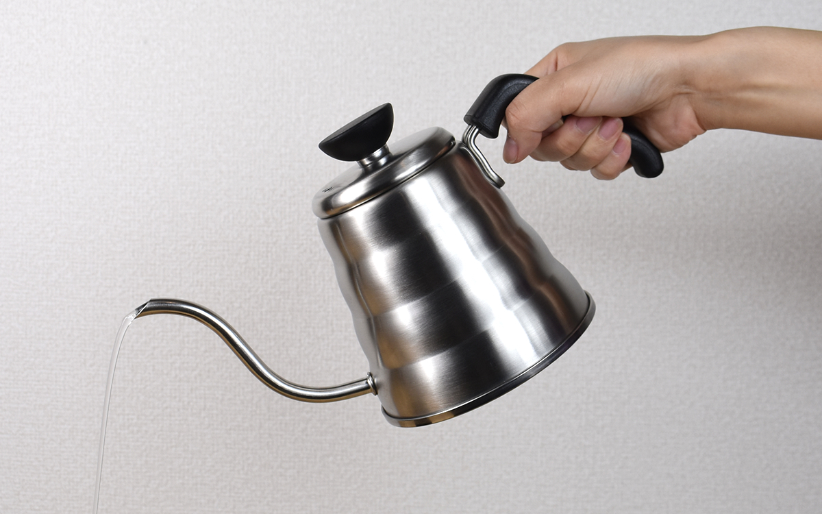 実際にお湯を注いでみたところが下の画像。角度のついた波線状のハンドルは握った指がフィットしやすい形状で、お湯がたっぷり入っていても手元は一切ブレず。ご覧のとおり手首を少し傾けるだけで、しっかりコントロールしながらお湯を注ぐことができました。