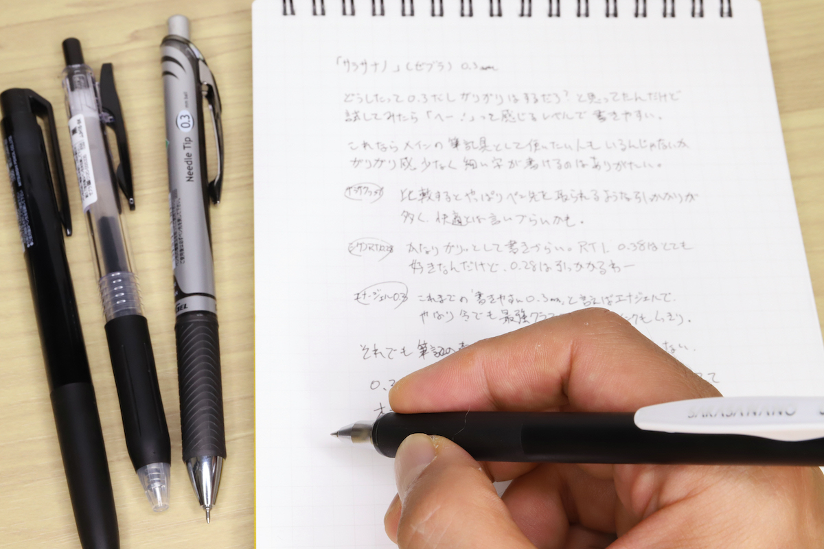 筆者も、ゲルインクの細径が好きでメイン筆記具にしているが、それでも0.38mm(≒0.4mmクラス)。この0.1mmの差は数字以上に大きくて、正直、自分には0.3mmは使いこなせないなー、と諦めていたのである。