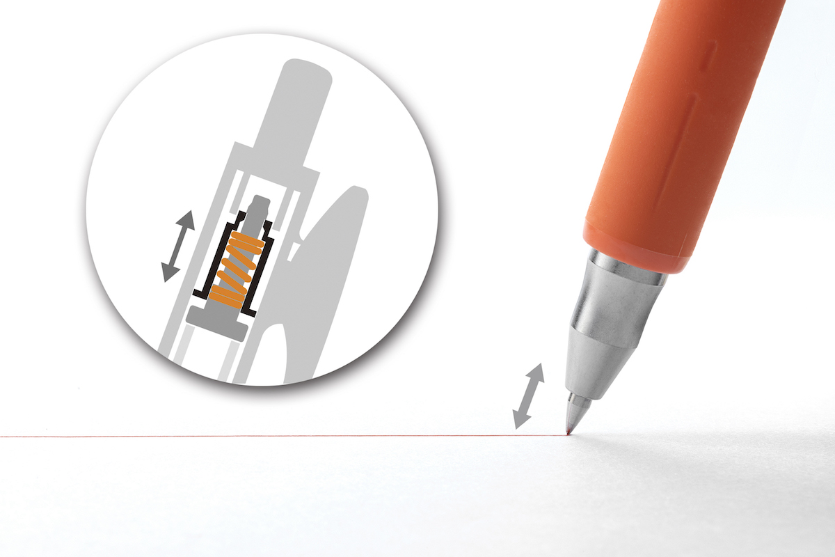 そしてもう1本が、軸後端に収まっている振動抑制用の後バネ。「うるふわクッション」と名付けられたパーツである。この後バネが、サスペンションとなってリフィルの上下動を吸収。ガリガリした振動を抑制する、という仕組みなのだ。