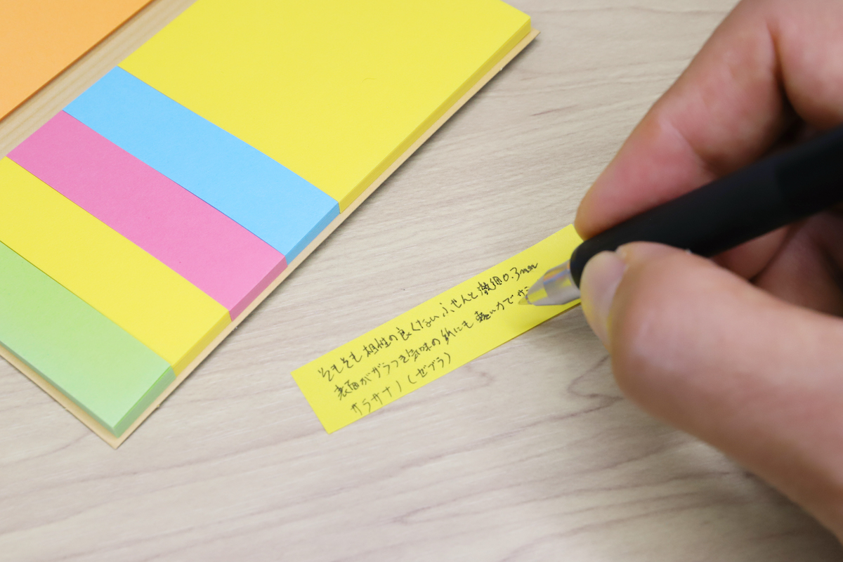 従来のゲル0.3mm径にとって、付箋は鬼門だったと言える。付箋は書き込み面積が少ないだけに、細い字で書き込みたい。しかし表面がザラッとしている(平滑度が低い)ため、特にペン先がガリッと引っかかる率が非常に高かったのである。