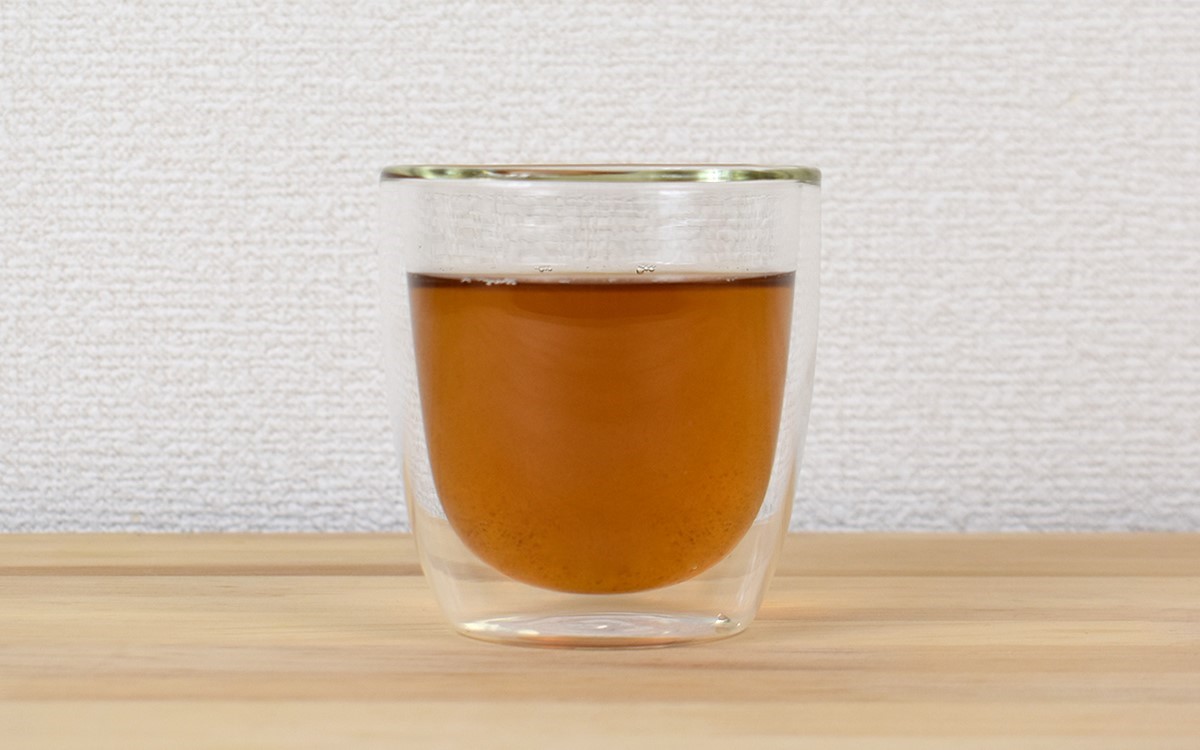 それでは、実際にドリンクを注いでみましょう。ガラスが二層になっているため、横から見るとまるで飲み物が浮かんでいるように見えるのがおしゃれ。普段飲んでいるお茶やコーヒーでも、いつもより少しスタイリッシュな食卓に感じられました。特に冬は「保温性の高いコップを使いたいけど、マグカップやタンブラーはちょっと…」というシーンでも使いやすく、来客用としてもオススメですよ。