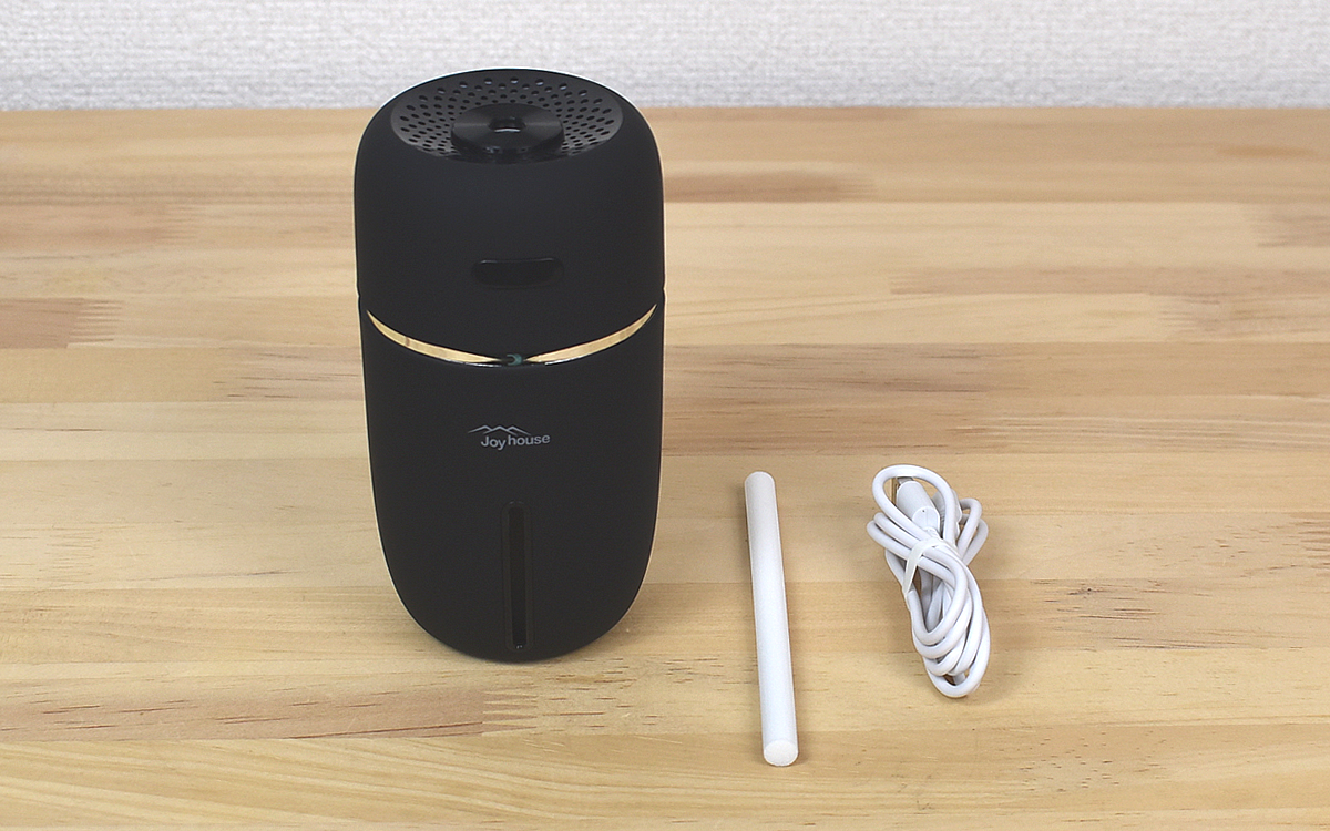 今回はシンプルなブラックを購入。マットな質感と、年齢や性別を問わず使えるデザインがポイントです。容量200mlの加湿器本体の他に、USBケーブルと交換用給水芯が付属していました。