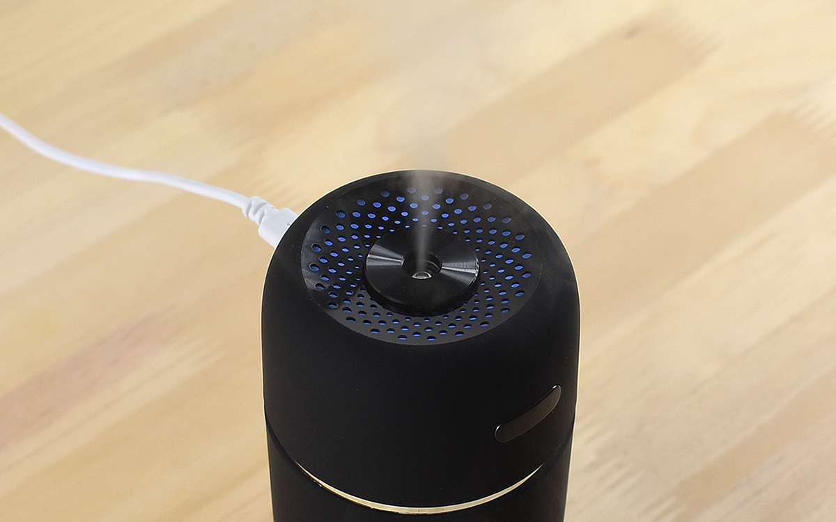 使用する際は本体内に200ml以下の水を入れ、USBケーブルで電源に繋ぐだけ。正面のボタンを押すとたちまち本体の上部からミストが噴出し、内蔵のライトが光り始めました。