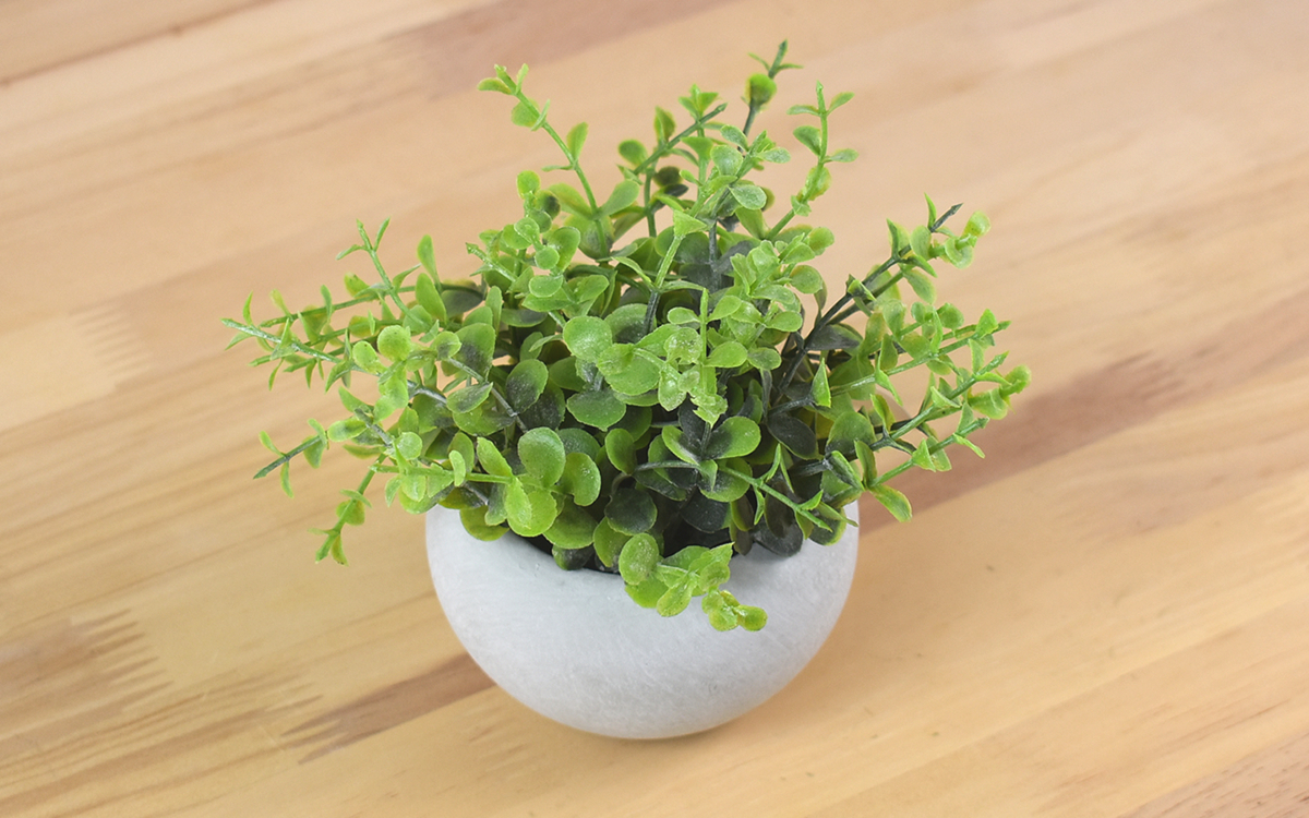 パっと目にした瞬間、思わず「本物!?」と声に出してしまうほどリアルな同商品。16(幅)×13(奥行)×14cm(高さ)のコンパクトサイズですが、オレガノを模したフェイクグリーンが各方向に伸びているので動きを感じさせてくれます。また全ての葉が同じ緑色なのではなく、ところどころ濃淡がついている点も見逃せません。