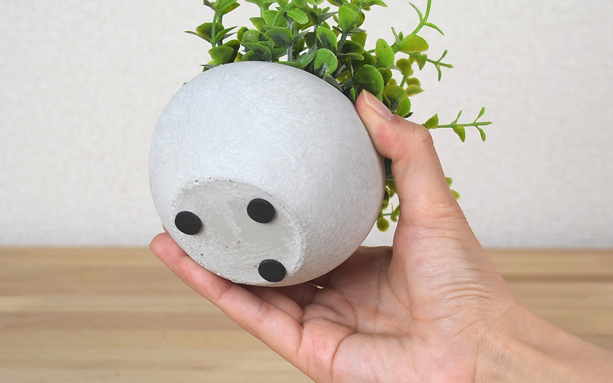 私のお気に入りポイントは、こじんまりとしながらも重厚感のあるポットの風合い。セメント製なので頑丈なのはもちろん、プラスチック製のポットには出せない質感がフェイクグリーンを“本物”に見せている理由の1つだと思えました。ちなみに丸みを帯びてころんとした形状のポットですが、ご覧のとおり底面にすべり止めがついているので安定感も問題ナシ。