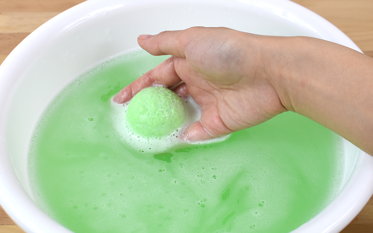 お湯を溜めた桶にグリーンティーを入れてみたところ、お湯に触れた瞬間バスボムからシュワシュワと細かい泡が。少しずつかたちが崩れていく一方、グリーンティーの色と香りがゆっくりと広がっていきます。桶の底にバスボムの細かい粒が沈んだものの、少しかき混ぜただけでしっかりお湯に溶けこんでくれました。