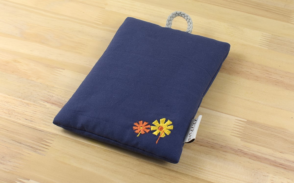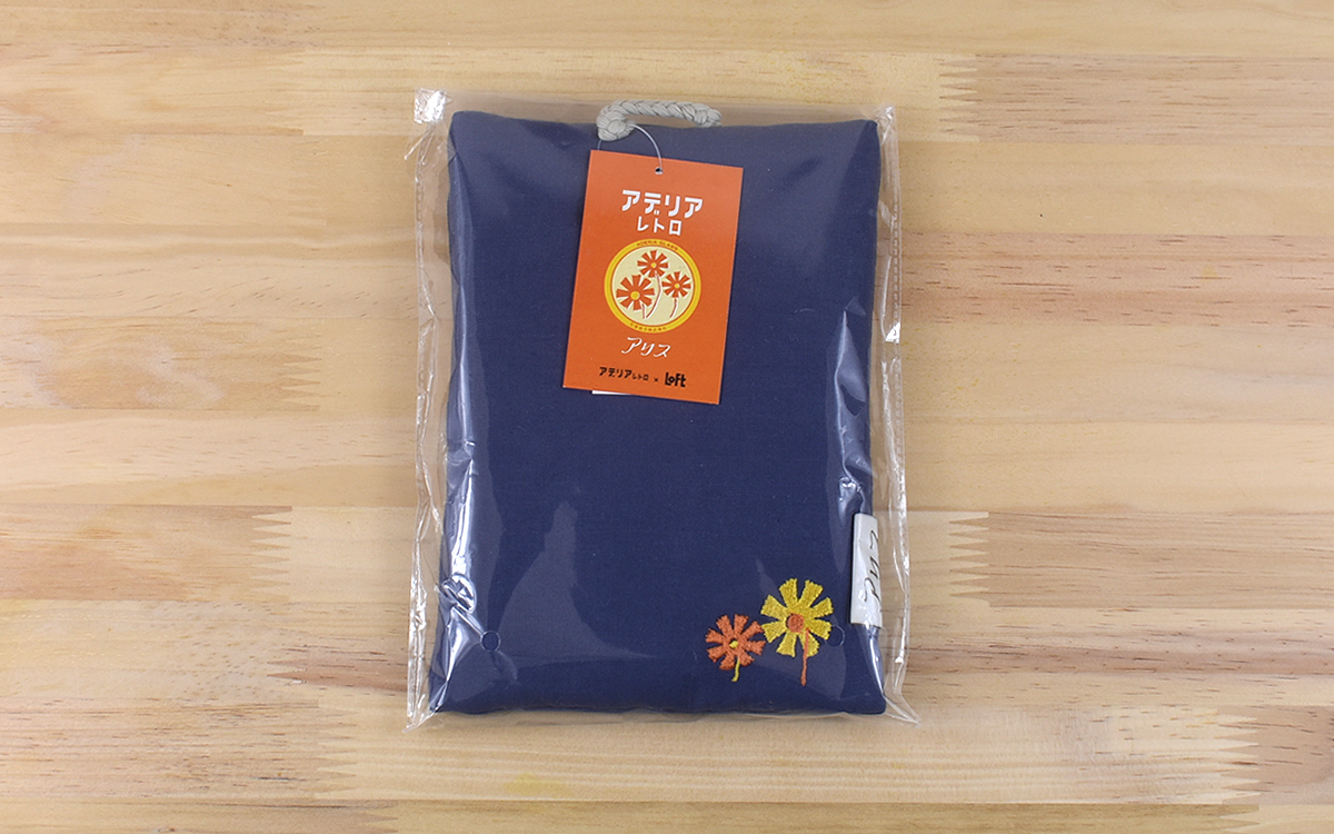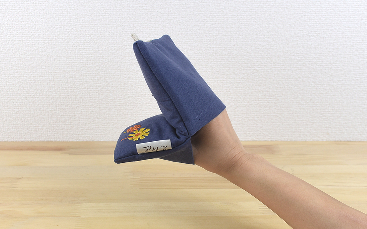 当時のアデリアが醸し出していた可愛さを、しっかりデザインに取り入れた同商品。14(幅)×19(高さ)×2cm(厚さ)と私の手のひらよりも少し大きいサイズながら、ふわっとした軽さが印象的です。手の差しこみ口は、2本の花を刺繍した面とは反対側。インド綿を素材にしたミトンは柔らかく、握る動作をしっかり伝えることができます。