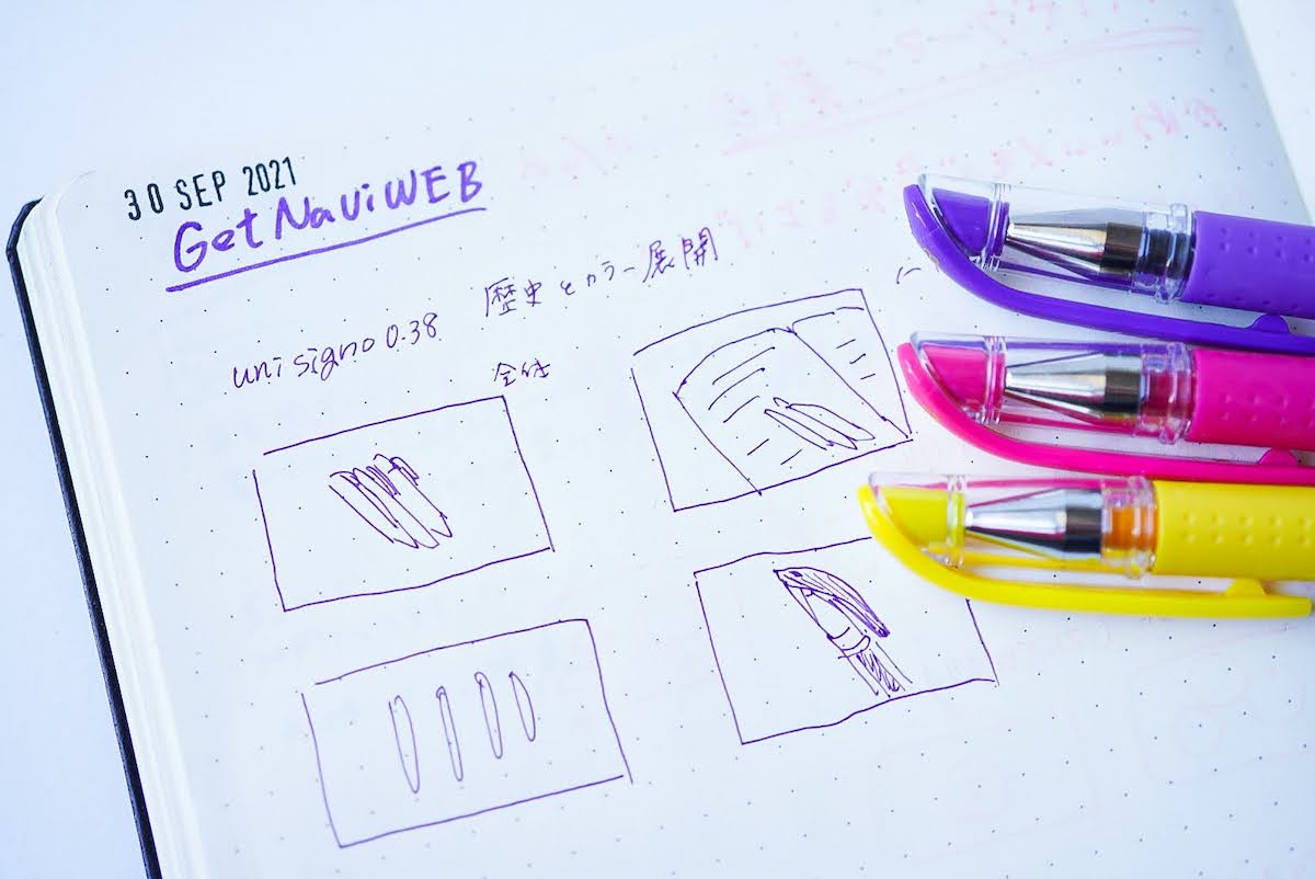 このように色への探求心が尽きないのがシグノの特徴です。書きやすいのは前述の通りですが、色数が豊富なので、文字を書くだけではなくイラストや図形にも向いています。私はアイデア出しの際にシグノを使っていますが、気分に沿ったさまざまなカラーのインクを使いたいので、シグノがぴったりなのです。