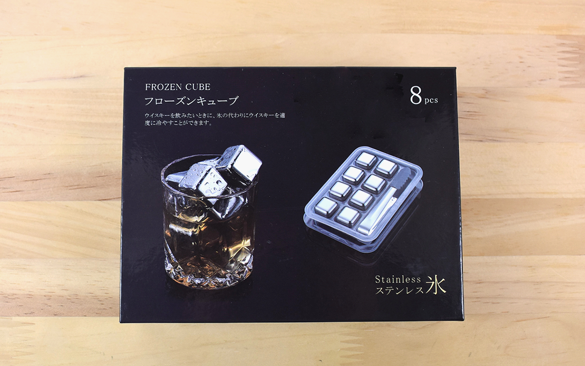 パッケージから出てきたのは、専用保存箱に収まった8個のキューブとトング。ステンレス製で約2.6cm四方のキューブは、サイコロに似ていて、つるんとした美しい見た目が印象的です。手にしてみて驚いたのは、冷やしていたわけでもないのに表面がヒンヤリしていること。4時間ほど冷凍庫に入れてからの使用になりますが、キューブがどれだけ冷えるのか楽しみです。