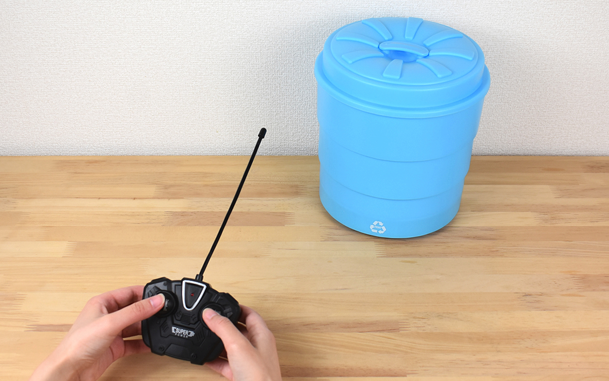 本体・送信機ともに電池をセットしたら、ゴミ箱を走らせるセッティングは完了。送信機には前進・後退に加えて前輪を左右に振るレバーもついているので、思いのほかアクティブな操作を楽しめました。