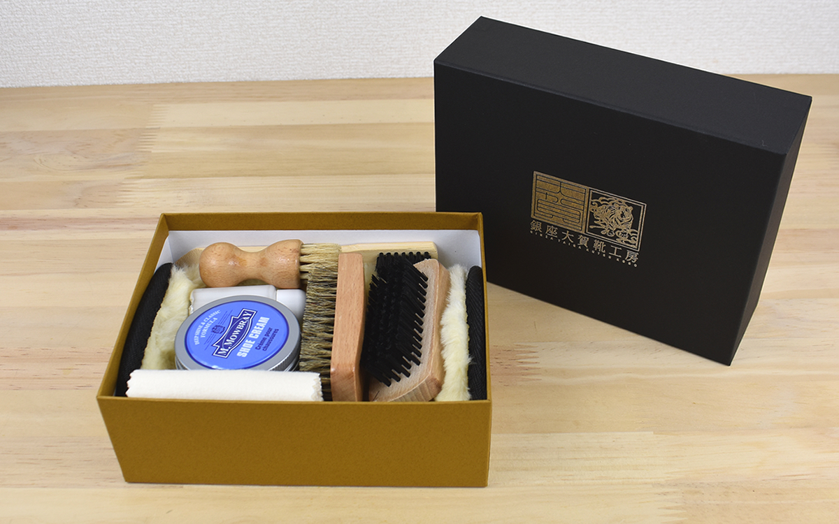●上質な紙箱に靴磨きアイテムをまとめた「M.MOWBRAY モウブレイ×銀座大賀靴工房 シューケアセット スターターセット」(銀座大賀靴工房)