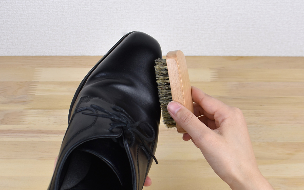 ブラシはそれぞれ特徴があり、たとえば下の画像の豚毛のブラシは靴クリームを塗るのに便利。コシのある化繊ブラシは靴クリームを伸ばす役割を持ち、やわらかい馬毛ブラシはほこり落としとして日常的に使用してもOKです。ほこりを落とした後にムートンクロスで靴を磨くとピカピカになりますよ。