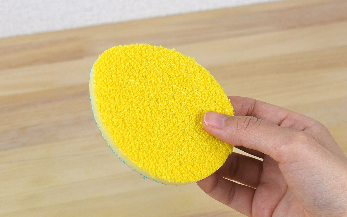同商品の大きさは約70(幅)×95(奥行)×15mm(厚さ)。手のひらにすっぽり収まるサイズ感で、従来のスポンジとは異なるたまご型のデザインになっています。また表裏で色が違い、黄色側の手触りはソフトな印象。一方青色側はハード樹脂加工が施されていて、指でなぞるとザラザラ音が響いたほどです。