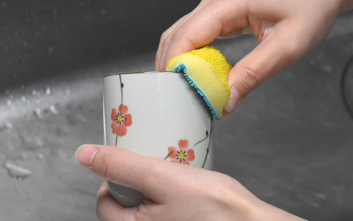 実際に湯飲みを洗ってみて「これは便利」と感じた点が、汚れ具合によってソフト面とハード面を使い分けられるということ。ハード樹脂面は洗剤いらずのパワーを備え、しっかり汚れをキャッチ。コンパクトで折り曲げやすいため、内側や縁も含めて湯飲み全体を丁寧に擦り洗いすることができました。