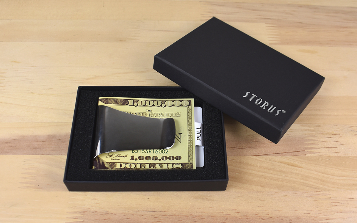 「STORUS」のブランドロゴが輝く、シックな黒いケースに収納された同商品。サイズは約7.5(縦)×5.5(横)×1.5cm(厚さ)ありますが、ステンレススチール製で約30gしかないため重さはほとんど気になりません。今回はシルバーカラーをセレクトしましたが、他にもゴールド・ピンクゴールド・グラファイトタイプも展開されているので併せてチェックしてみてください。