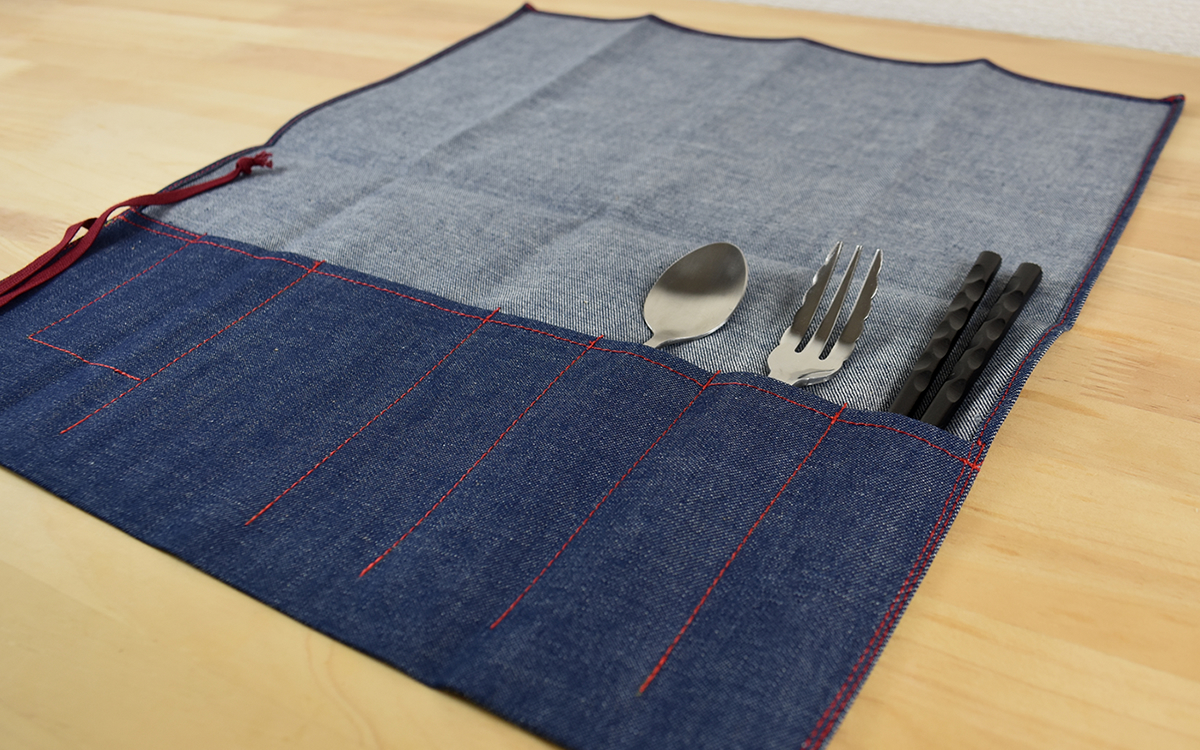 さすが岡山デニムの生地だけに手触りは柔らかく上質で、デニム特有の頑丈さもしっかり備えているためカトラリーの持ち運びにぴったり。手作業による縫製も味わいを感じさせてくれます。