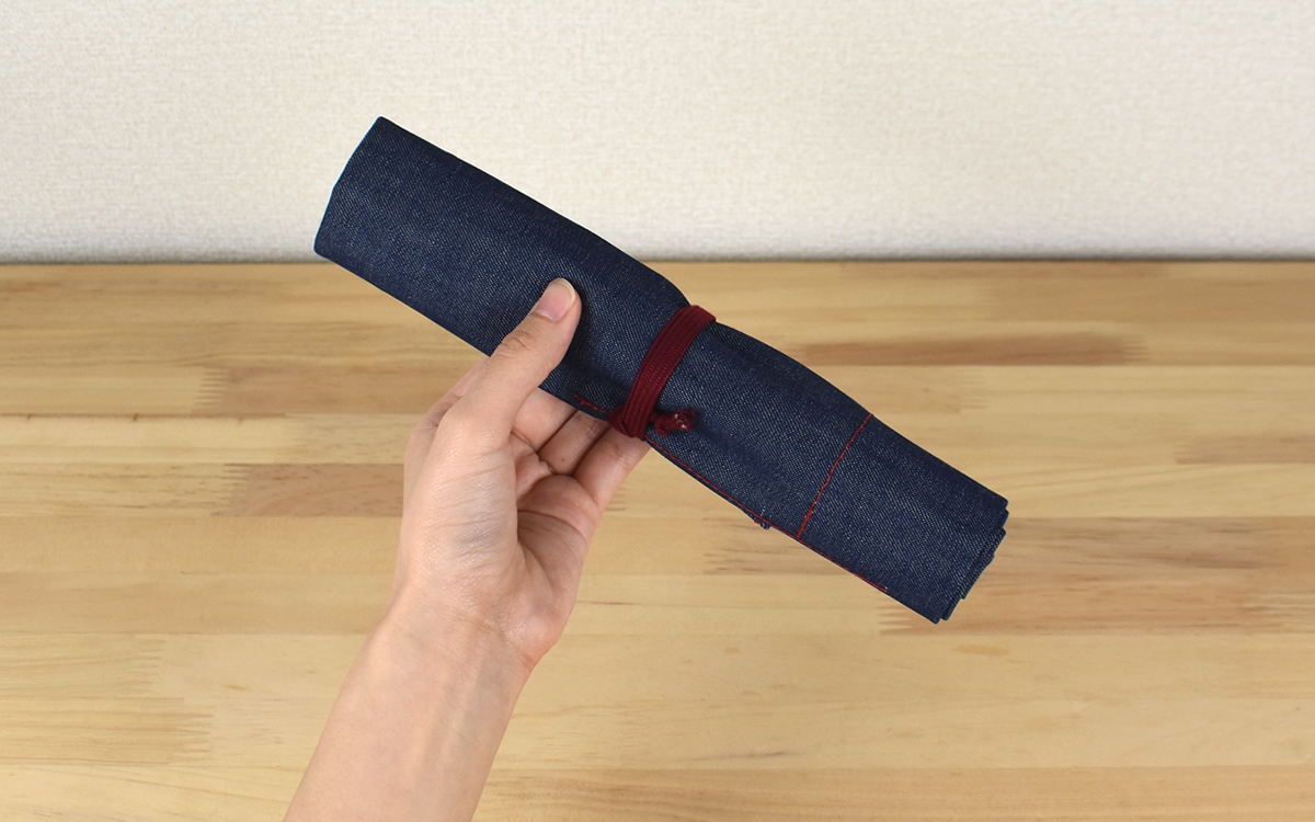 使い方は簡単で、まずはポケットに各カトラリーを収納。上側の生地を折り返してくるくると巻き、端にある紐を巻きつけて留めるだけです。実際に使用してみましたが、プラスチックケースと違ってカチャカチャ鳴らないのがGOOD。なお説明書きには「箸にとらわれることなかれ 入れて便利なものを収納すれば良し」との文言が添えられているので、たとえば文房具やメイク道具の収納にも便利ではないでしょうか。