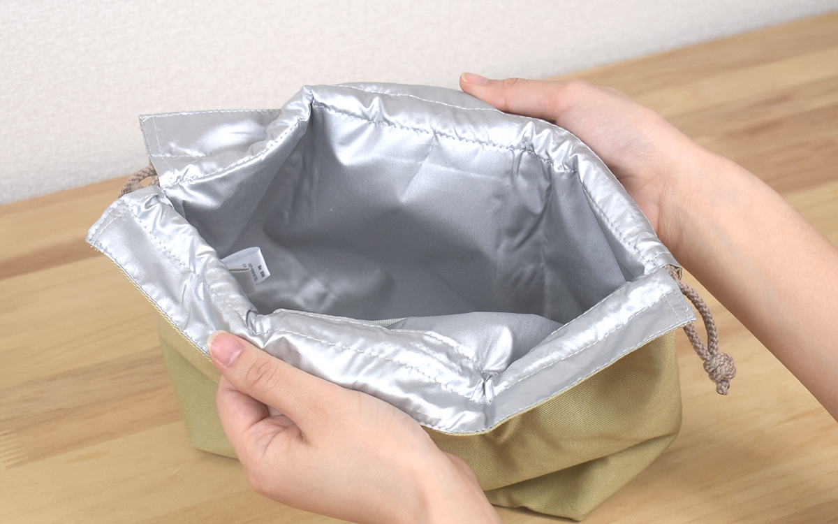 気になるのは商品名に含まれた“お手入れがしやすい”との文言ですが、どうやらその秘密は裏地のシルバーコーティング生地にあるよう。確かに表地の細かい繊維面に対して、裏地はツルツルした独特な手触りが印象的。汚れを拭き取りやすく、これなら万が一ランチボックスから汁が漏れ出てしまっても安心です。
