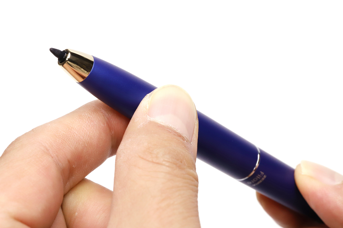 さらに、この高級感のある金属軸にもちょっと面白い工夫がされている。握ってみると分かるが、このサインペンは重心がかなり上側に配置されているのだ。昨今の低重心筆記具ブームの中ではやや不思議な感じもするが、実はこれも意図があってのこと。